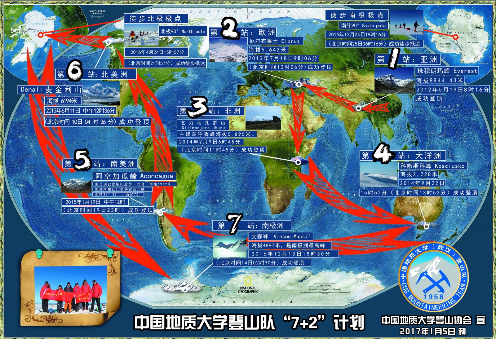此后,登山队不断挑战更多的高峰,包括欧洲厄尔布鲁士峰、大洋洲科修斯科峰、非洲乞力马扎罗峰、南美洲阿空加瓜峰、北美洲麦金利峰、北极点、南极洲文森峰、南极点。2016年12月25日,登山队完成“7+2”登山科考任务,即成功登顶七大洲最高峰和徒步穿越南、北极点,成为世界首支完成这一壮举的大学登山队,书写了中国高校体育运动史上的传奇。