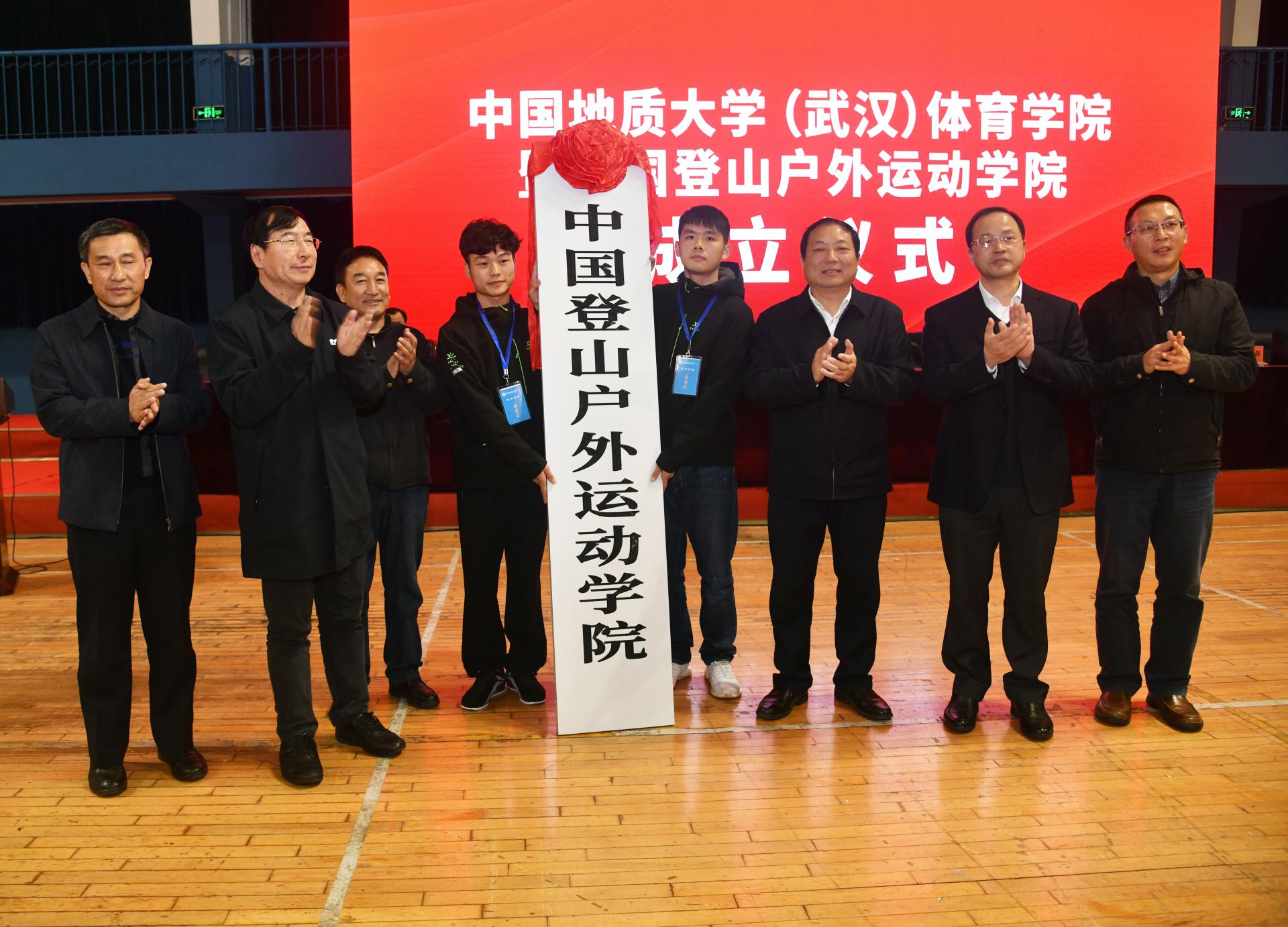 李致新、胡功民、旺青格烈、何光彩、王志强、陈林祥共同为中国登山户外运动学院揭牌