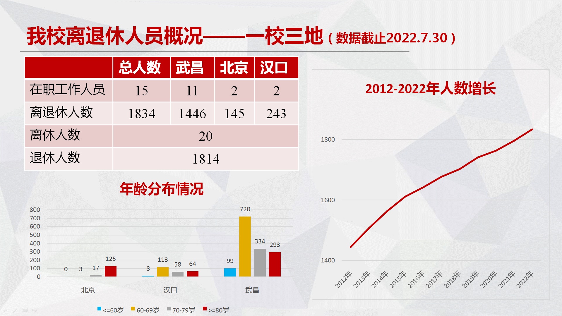 截至2022年7月,学校共有离退休人员1834人(其中离休20人、退休1814人),组织关系在离退休工作党委的党员770名,设有23个党支部。