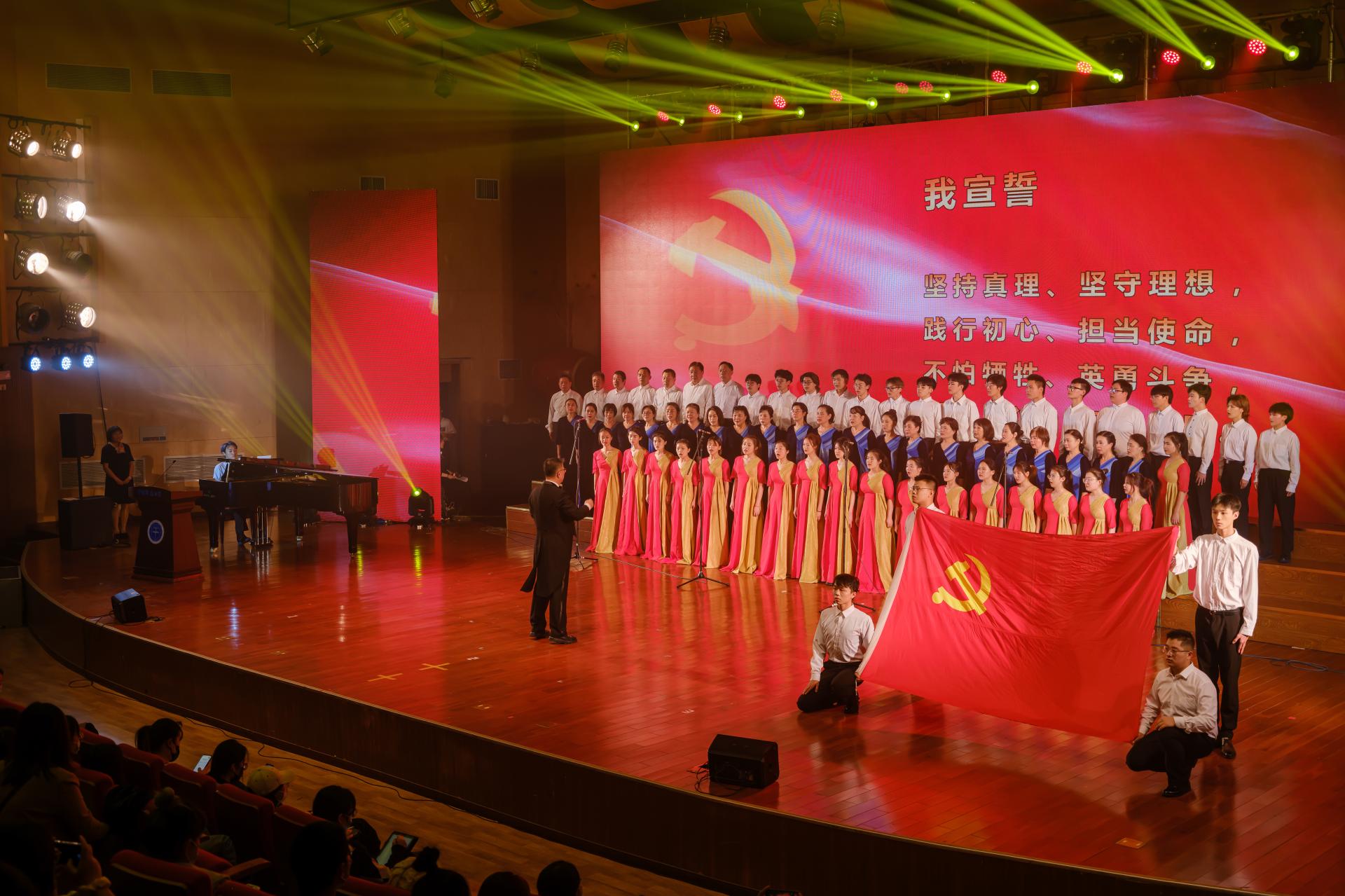 本次艺术党课分“开天辟地”“改天换地”“翻天覆地”“惊天动地”四个篇章,党委组织部部长陈文武、副部长冷再心,艺术与传媒学院党委书记郭秀蓉、党委副书记边建华、音乐系党支部书记周黎担任讲课人,以百年党史为经,以重大历史关头红色经典背景故事为纬,通过情景表演、合唱、舞蹈、器乐演奏、朗诵等多种艺术形式,呈现了党在百年征程中凝聚的红色精神和中国力量,激发广大师生在新时代奋进新征程。