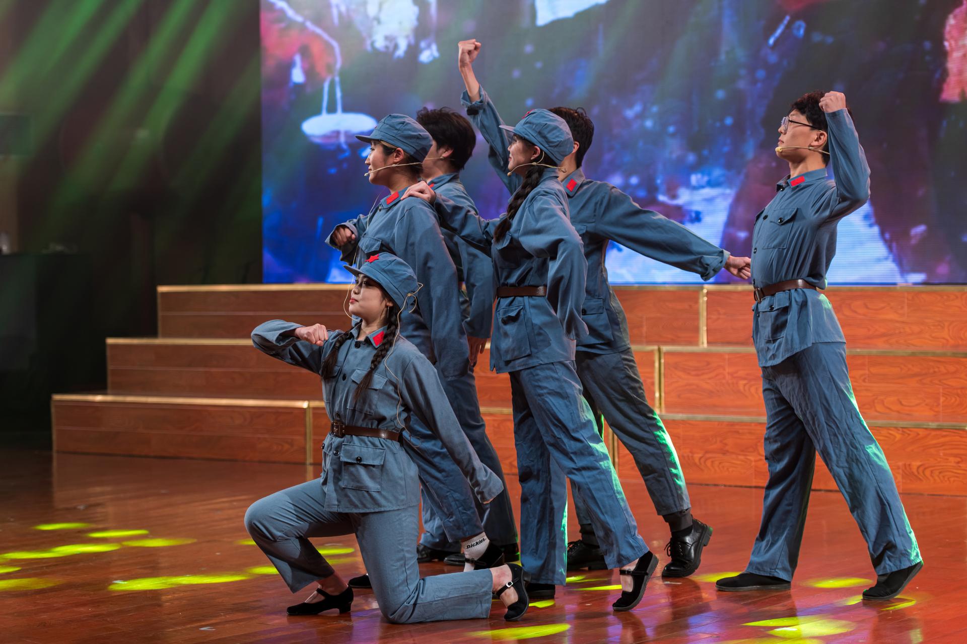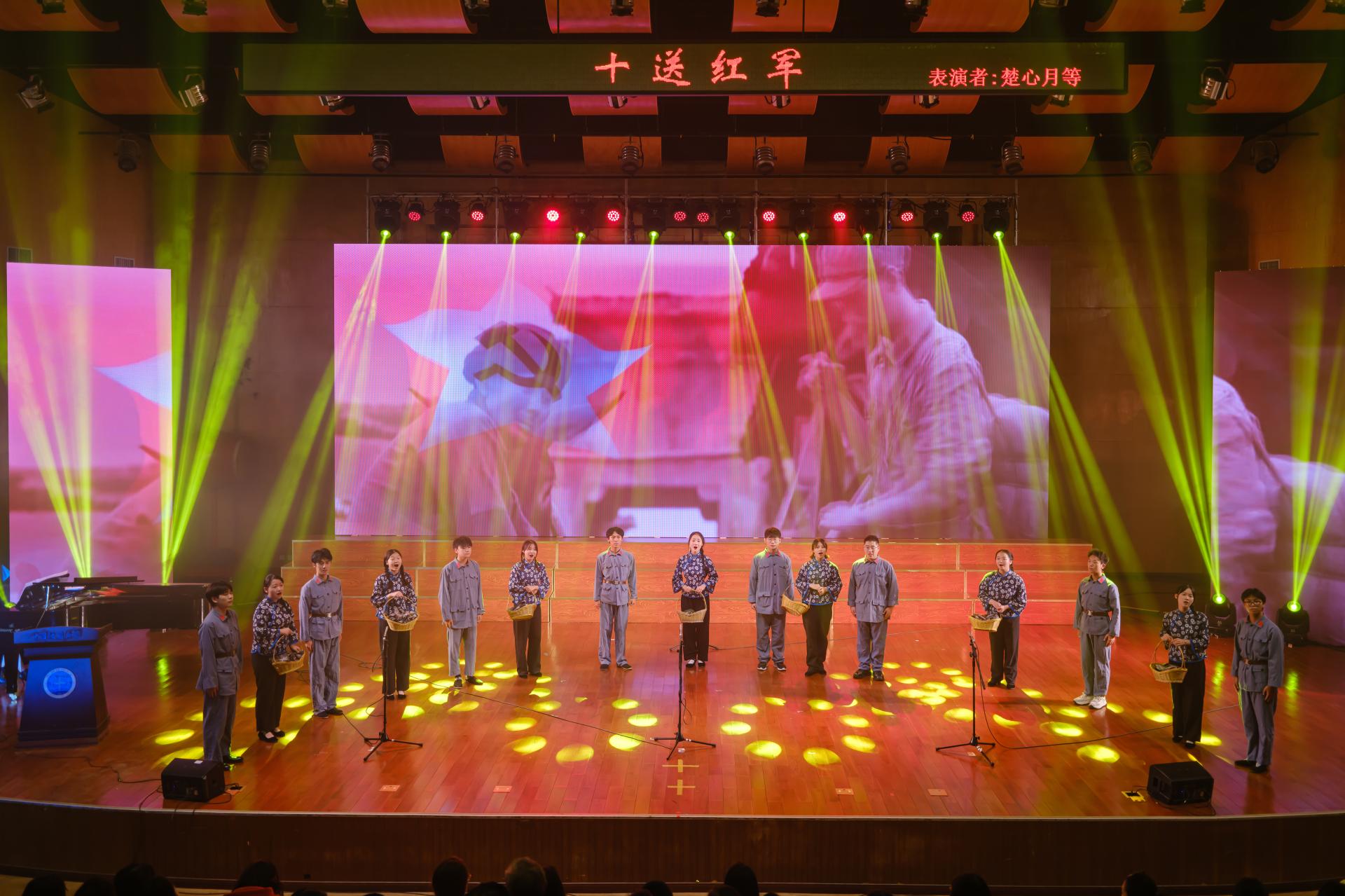 在四个篇章中,将新民主主义革命时期、社会主义革命和建设时期、改革开放和社会主义现代化建设时期以及中国特色社会主义新时代四个历史阶段的时代内涵,用艺术的方式娓娓道来。《三大纪律八项注意》《十送红军》等节目,为师生展现了中共一大召开、红军长征等具有重大意义的历史事件;《没有共产党就没有新中国》《我爱你中国》等歌曲燃起了现场师生的爱国之心;舞蹈《党旗更鲜艳》、舞龙《北京欢迎你》表演,引来观众阵阵掌声;《人民至上》《灯火里的中国》《万疆》等表演,彰显出师生不忘初心、牢记使命的坚定信念。歌曲《领航》唱出了穿越时空的信仰强音和共产党人的初心使命。