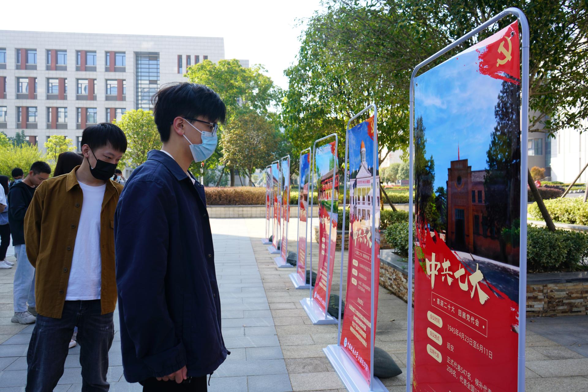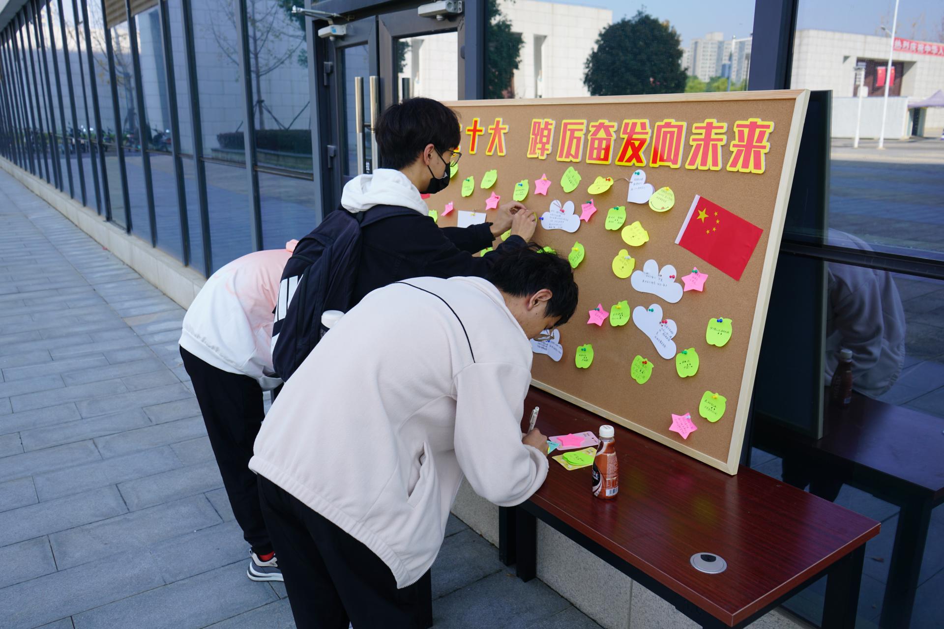 活动现场展示了主题宣传展板,中国共产党历次党代会重点内容学习海报,以及庆祝党的二十大胜利召开祝福寄语墙,引发师生学习、热议。