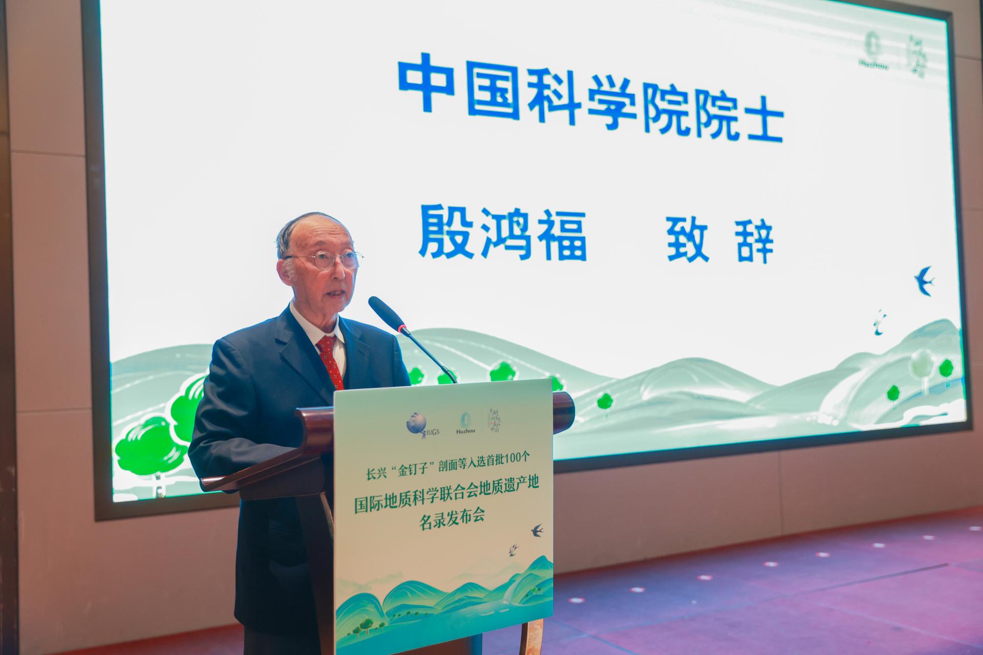 殷鸿福院士致辞。他说,“从上个世纪七八十年代开始,我的目光从未离开过长兴‘金钉子’,今天非常荣幸包括其在内的7个中国地质遗产地入选全球首批地质遗产地名录,这是各遗产地长期努力的结果,也是地质工作者长期辛勤付出的成果”。他表示,长兴“金钉子”入选世界地质遗产地名录,意味着新的开始,作为长兴“金钉子”院士专家工作站的成员,将会继续围绕“金钉子”开展学术研究,充分发挥“金钉子”的科学价值,培养更多拔尖创新人才。