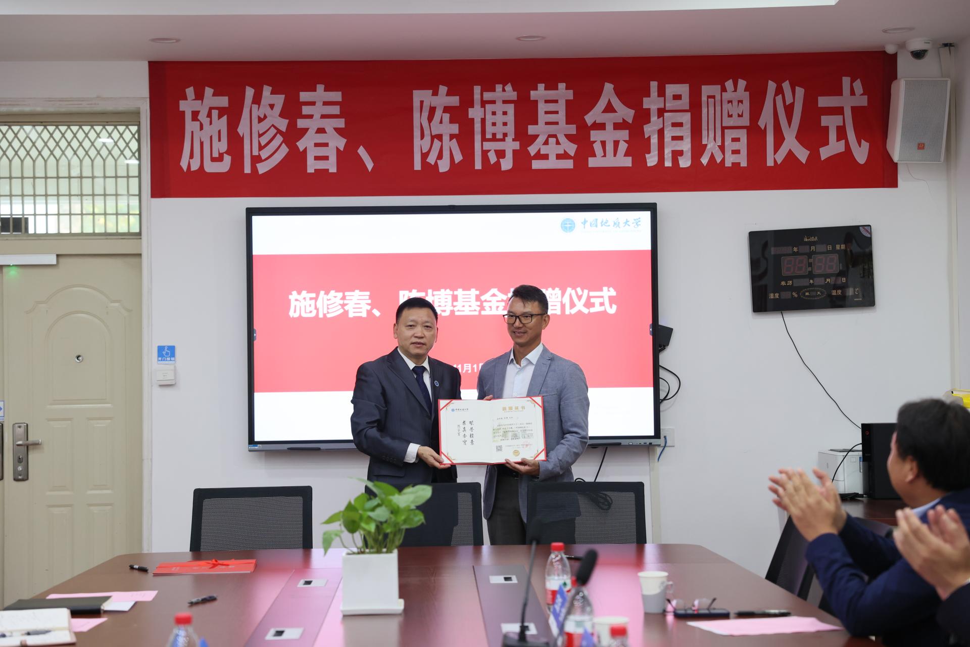 施修春校友、后勤党委书记徐岩、校友与社会合作处处长陈华荣代表三方签订《捐赠协议书》,王林清代表学校向施修春校友颁发《捐赠证书》。
