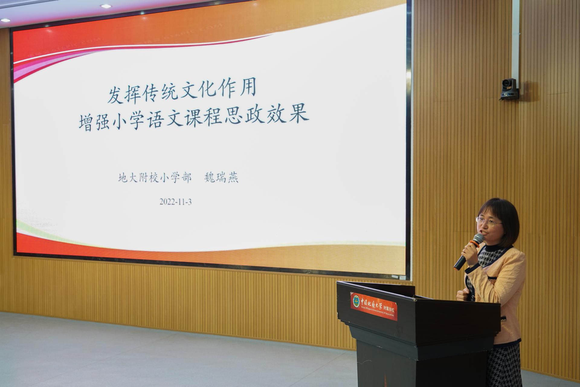 附属学校小学部魏瑞燕老师作《发挥传统文化作用,增强小学语文课程思政效果》专题报告。她结合自己日常的教学实践,从中华优秀传统文化中提取思政教育元素,研究诗歌诗人,厚植爱国情怀,做到思有源头,学有念头;挖掘名言警句,培植诚信基因,做到斧正苗头,教有干头;运用经典故事,根植坚毅品质,做到不怕苦头,行有奔头。