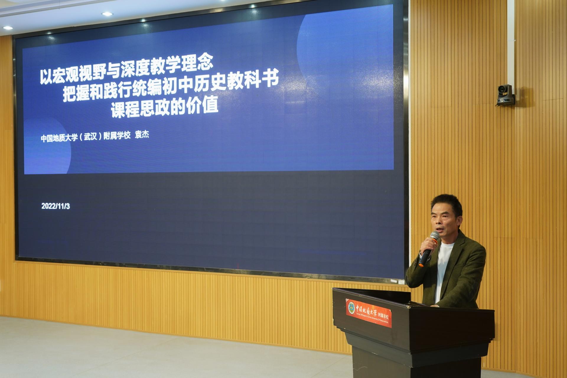 附属学校副校长袁杰作《宏观视野与深度教学理念把握和践行统编初中历史教科书课程思政的价值》报告。他认为,在课程理念上要把“求知”和“立德”有机结合起来,做到既有知识传授,又能将课程知识背后的“价值与德性”呈现出来,促进形成课堂知识与价值引领的成才观,知识传授与育人体系的成熟观,历史元素与思想涵养的成长观,民族尊严与国家统一的成就观,学校目标与求知统一的成绩观,浴血奋斗与五个认同的成名观,整合教学与历史阶段的成功观。
