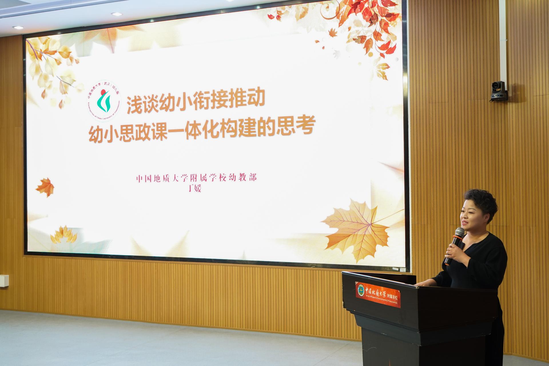 附属学校幼教部丁媛老师作《浅谈幼小衔接,推动幼小思政课一体化构建的思考》专题报告。她表示,作为一名幼儿园教师,要落实分层管理与分解模式一体化、家庭教育与日常工作一体化、红领巾活动与幼儿活动一体化、生活习惯与思政课程一体化、年龄差异与目标要求一体化、教研挖掘与价值能力一体化、考核机制与思政效果一体化,促进家校沟通,活动互动,共享资源,幼小合作。