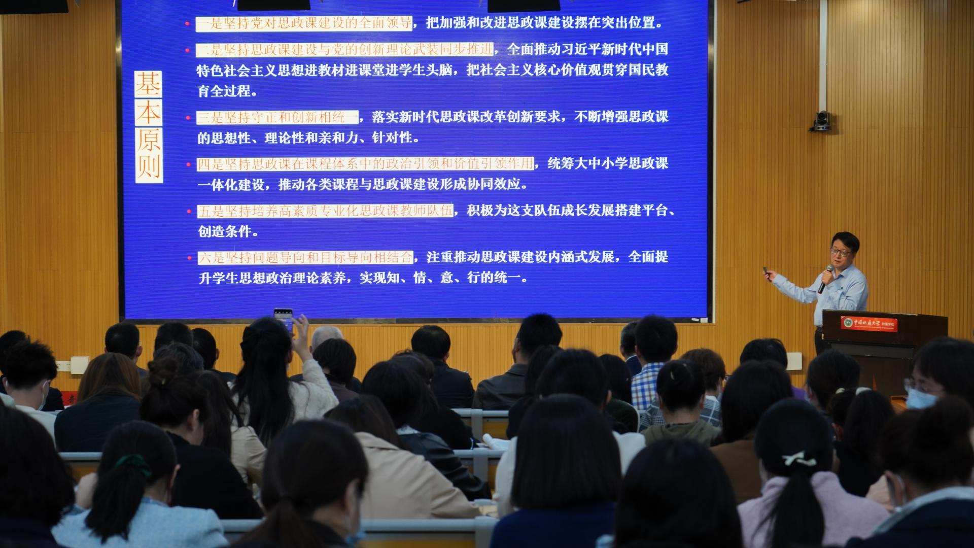 附属学校党总支书记张瑞生作专题报告,他强调,要把思政课建设作为附属学校落实立德树人根本任务的重要抓手,加强理想信念教育、中华优秀传统文化和革命历史教育,做到课程思政与思政课程相结合,体验学习与阵地教育相结合,新课标与培根铸魂相结合,五种个性与五项修养相结合,教研活动与生活基础相结合,社会实践与理论创新相结合,道德修养与关键能力相结合,意识形态与校本课程相结合。他从十个维度,提出附属学校改进课堂思政工作方法,提出道法课贯标纵向到底,语文、历史、地理、美育和体育等课程横向到边,建构一体化课堂思政育人体系。