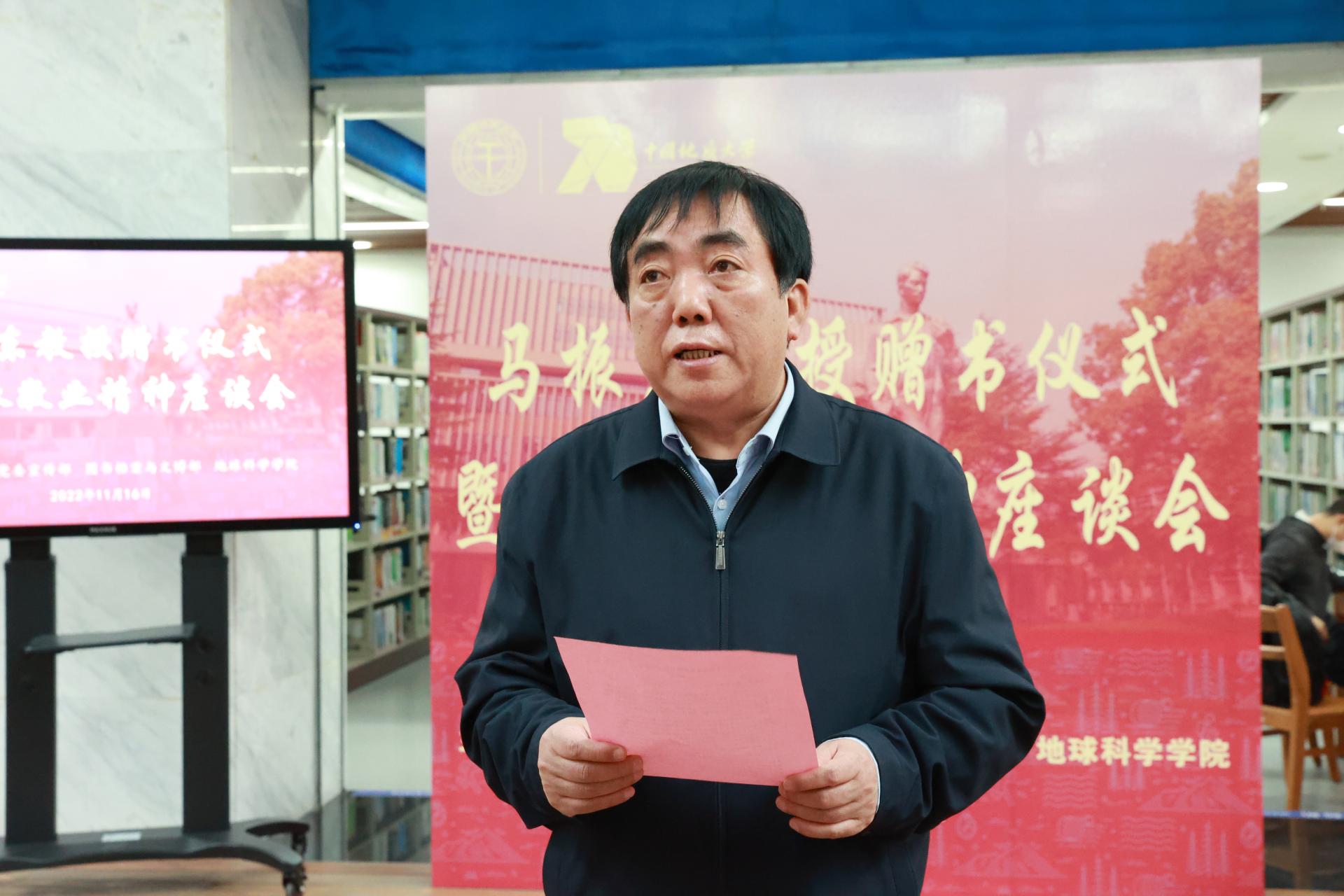 赖旭龙致辞。他说,马振东教授此次捐赠的《中国矿产地质志——中国地球化学场与成矿关系研究》,填补了新中国成立以来地球化学场与成矿关系研究的空白,为普及矿产资源国情和地学知识,将发挥积极作用。他希望马振东教授继续为学校人才培养、科学研究发挥积极作用。他要求,师生们要传承并发扬爱岗敬业精神,共同推动学校事业高质量发展。