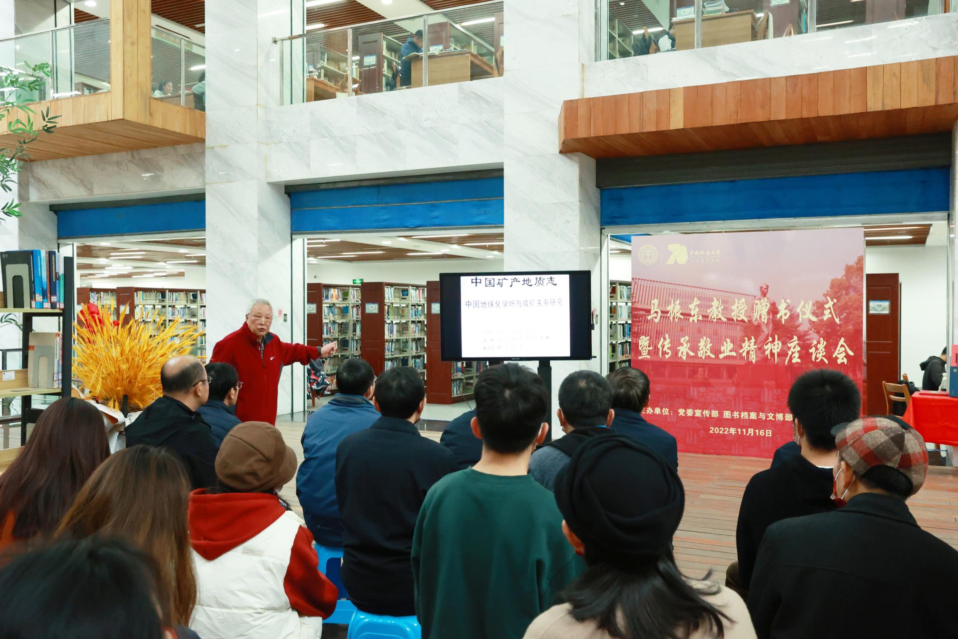 opta足球新闻网讯(通讯员 徐燕 刘安璐 梁胜男 摄影 孙彦钦)11月16日,马振东教授赠书仪式暨传承敬业精神座谈会在南望山校区图书馆举行。仪式上,地球科学学院退休教授马振东向图书档案与文博部捐赠了14本《中国矿产地质志——中国地球化学场与成矿关系研究》。副校长赖旭龙,党委常委、宣传部部长储祖旺,各相关部门、学院主要负责人及师生代表参加赠书仪式。
