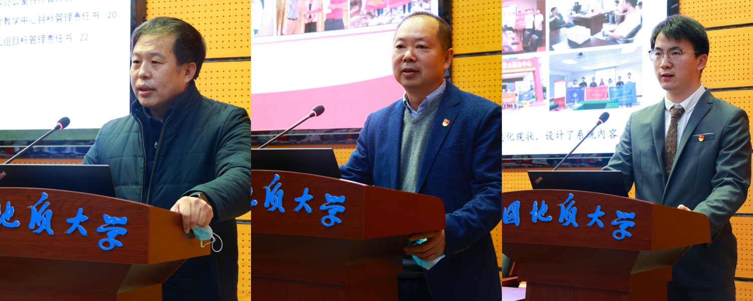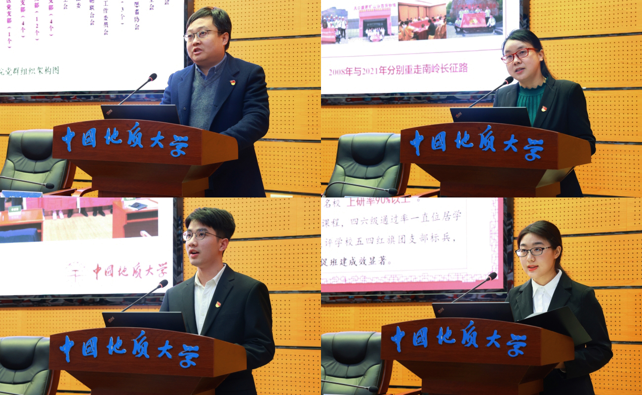 资源学院党委书记高复阳、地球科学学院地球化学系党支部书记谢淑云、地球物理与空间信息学院刘光鼎党支部书记翟基辉、马克思主义学院青马筑梦党支部副书记左睿,作为学校“标杆院系”“样板支部”培育创建优秀单位代表发言,介绍了各单位党建“双创”工作的基本思路,分享了以党建为核心带动科研创新、人才培养、社会服务、产学研合作等方面的主要举措。