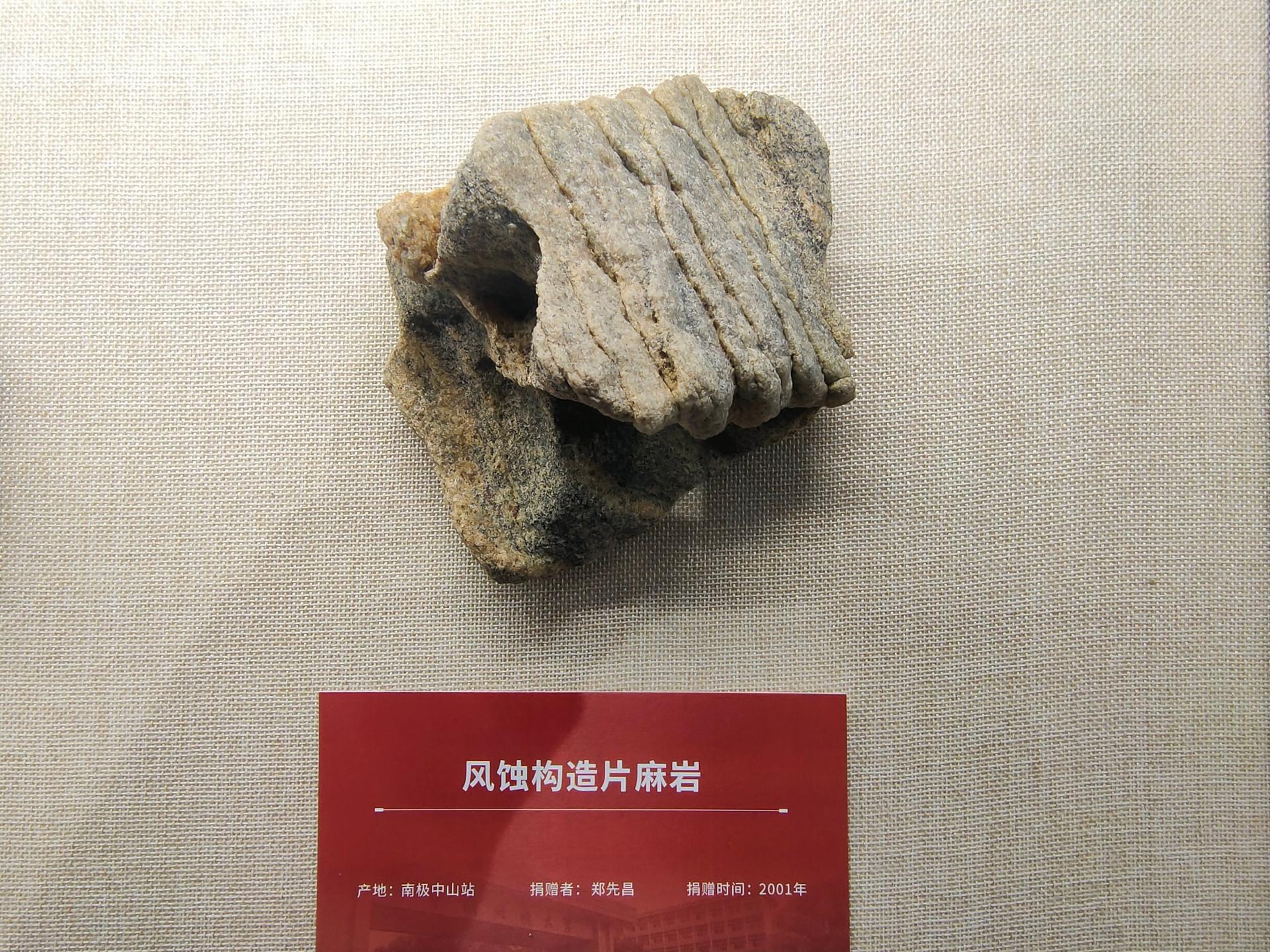 在“校友捐赠藏品展”,还有一块风蚀构造片麻岩标本,它同样产自南极,是由郑先昌博士2005年捐赠的。2004年10月,opta足球1987级校友郑先昌博士随中国南极第21次科考队赴南极,进行为期5个多月的科学考察。在南极期间他对我国两个站区冻土及建筑物冻融危害进行全面调查,这是我国第一次在南极地区进行工程地质勘探。同时,由他提出的利用“钢梁基础+地锚加固”的方法,在南极中山站实验取得成功,使我国南极站区首次利用风力发电,为南极站区建设作出了突出贡献。