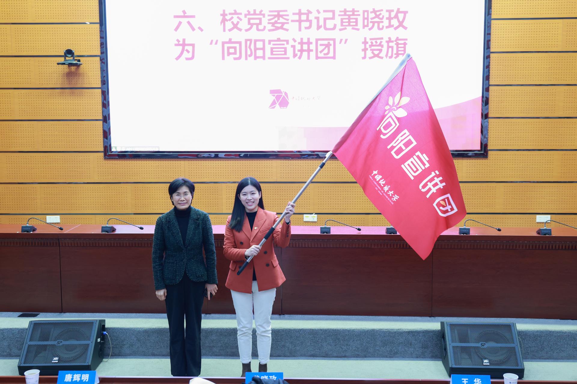 为加强师生理论武装,用青年话语更好宣传党的创新理论和路线方针政策,本科生院(党委学生工作部)在宣讲大赛决赛现场成立“向阳宣讲团”。黄晓玫为“向阳宣讲团”授旗,首任团长徐天宜代表“向阳宣讲团”接过团旗。