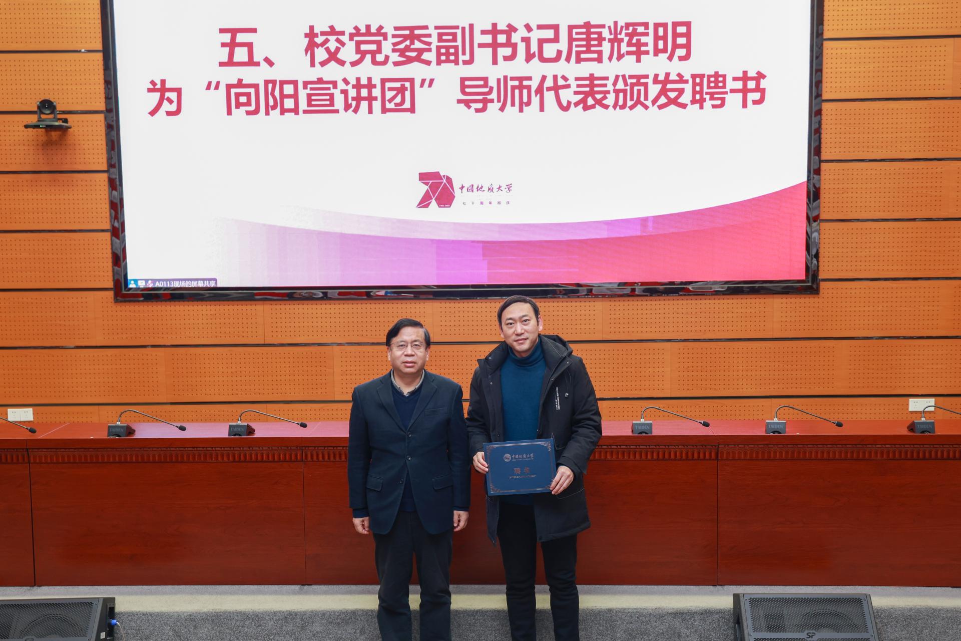唐辉明为“向阳宣讲团”导师代表阮一帆颁发聘书。