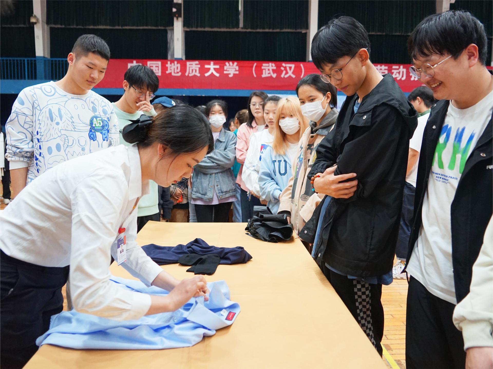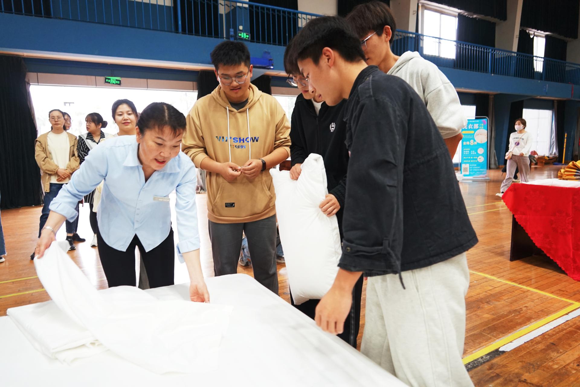学习实践环节,同学们纷纷摩拳擦掌,上手学习铺床单、套被子、叠羽绒服、叠衬衣等各类房间整理生活技巧。尽管屋外细雨绵绵,室内却热火朝天。