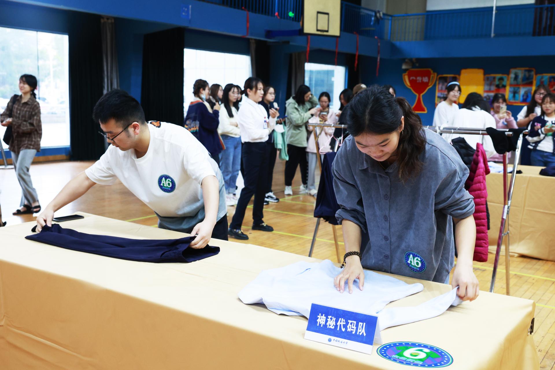 比赛环节,参赛选手现学现用。动作干净利索,甩单、包边、包角、套被芯、叠豆腐块、套枕芯……一整套铺床动作一气呵成,行云流水。羽绒服、衬衣、裤子、袜子,在参赛选手的手中排列成了整整齐齐的小方块,不知不觉,个个都成为高手。