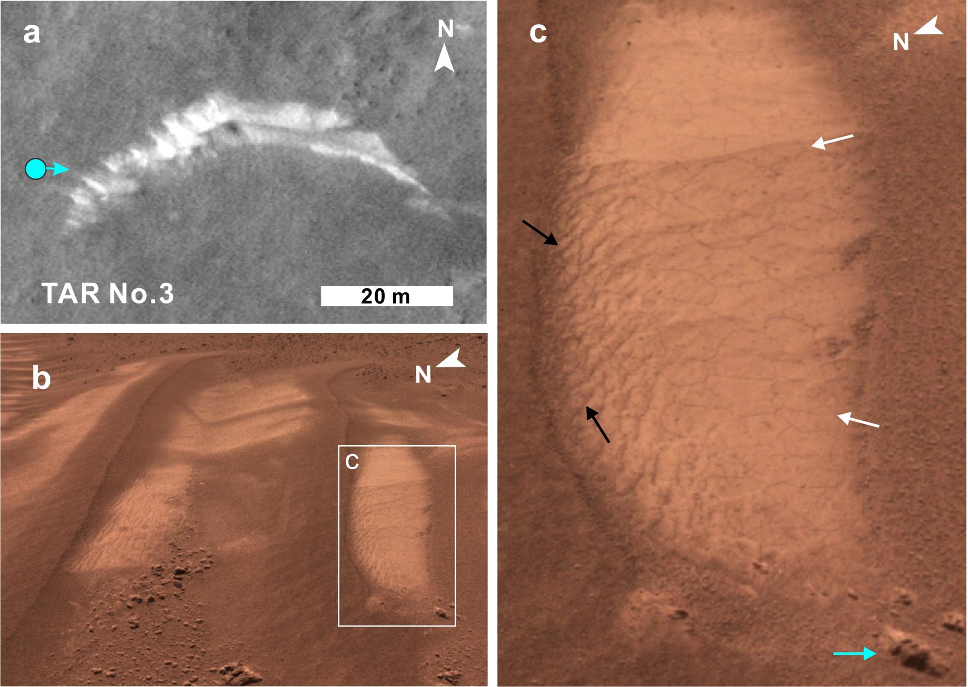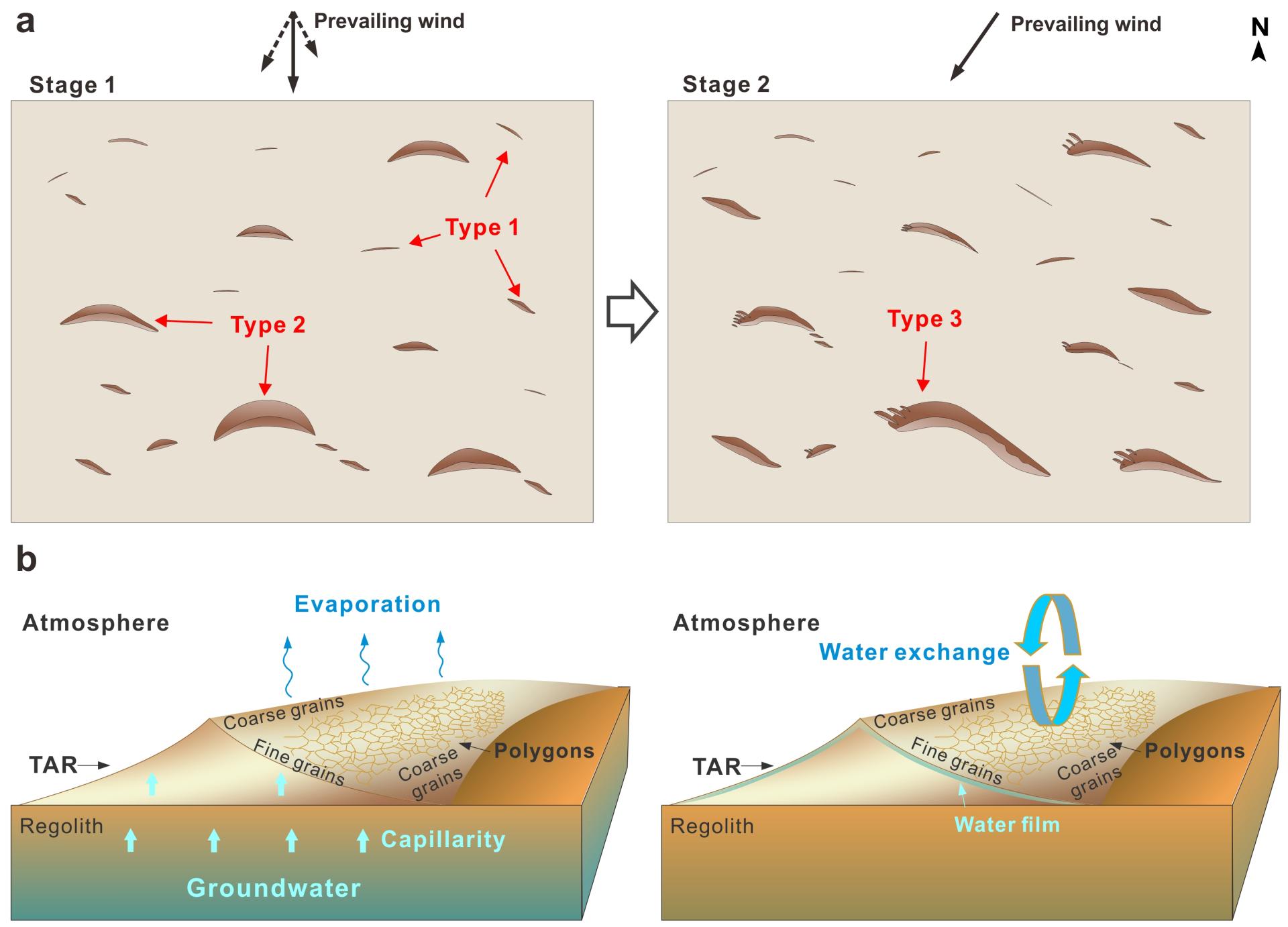 基于上述分析结果,结合着陆区的地质背景,研究认为这些多边形裂隙可能存在两种成因(图4b):地下水通过毛细作用被输送至横向风成脊表面,在水分蒸发过程中表面收缩形成多边形;地表与大气中的水汽交换导致横向风成脊表面形成硬化的砂质壳层,壳层破裂形成多边形裂隙。在当前的火星环境条件下,第二种成因机制最为可能。