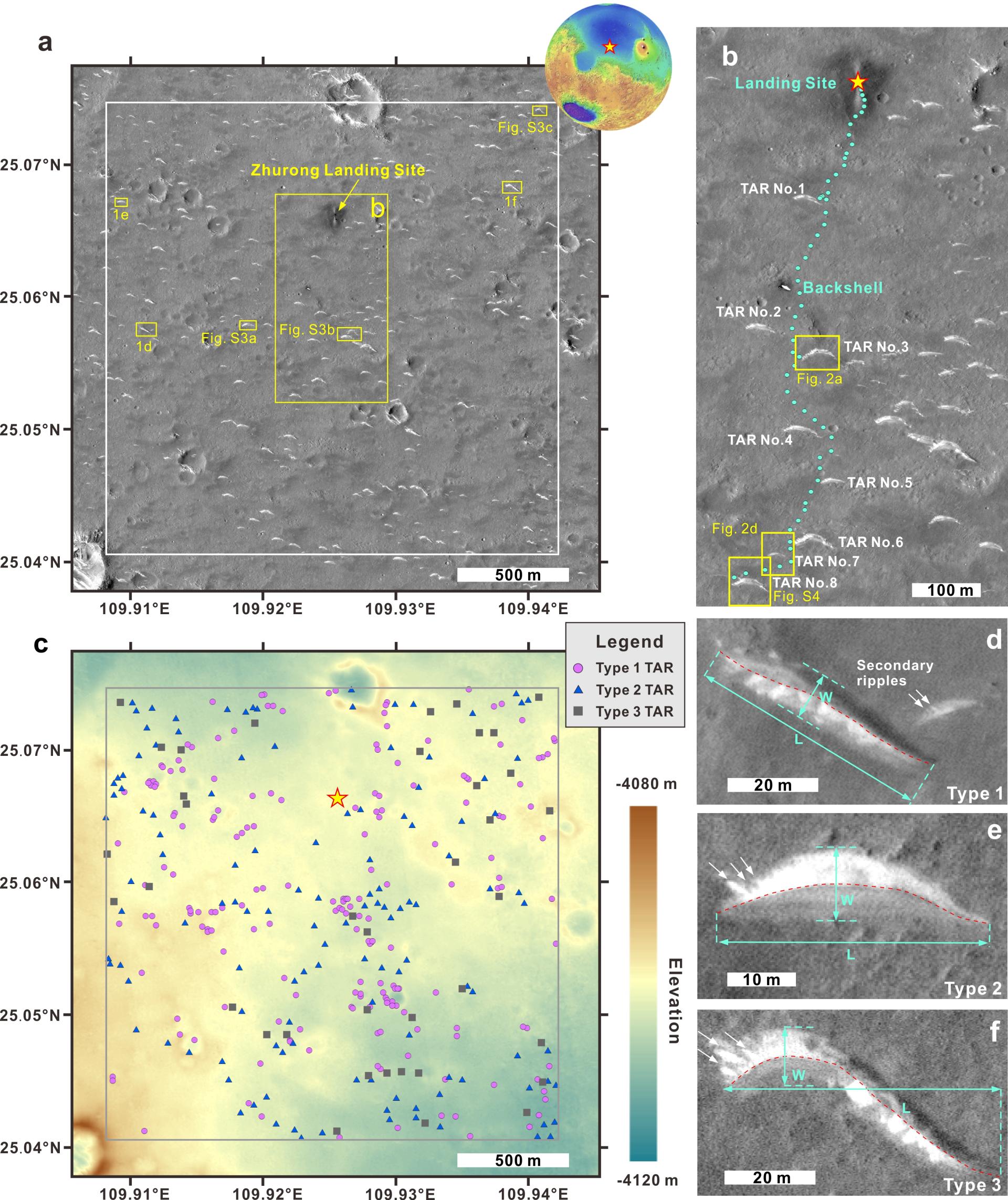 2021年5月,我国“天问一号”探测器携带的“祝融号”火星车着陆于乌托邦平原南部,在其着陆及巡视范围内分布有大量的横向风成脊(TAR)(图1)。横向风成脊是火星表面一类特殊的风成地貌,是研究火星大气运动及气候特征的重要载体。本研究利用高分辨率遥感数据,在火星车着陆区2 km×2 km范围内识别出354个横向风成脊,并根据形态特性划分出三个类型(图1),提出了该区域横向风成脊的两阶段演化模型(图4a),指示着陆区当地的盛行风向曾经发生过一次显著的改变。