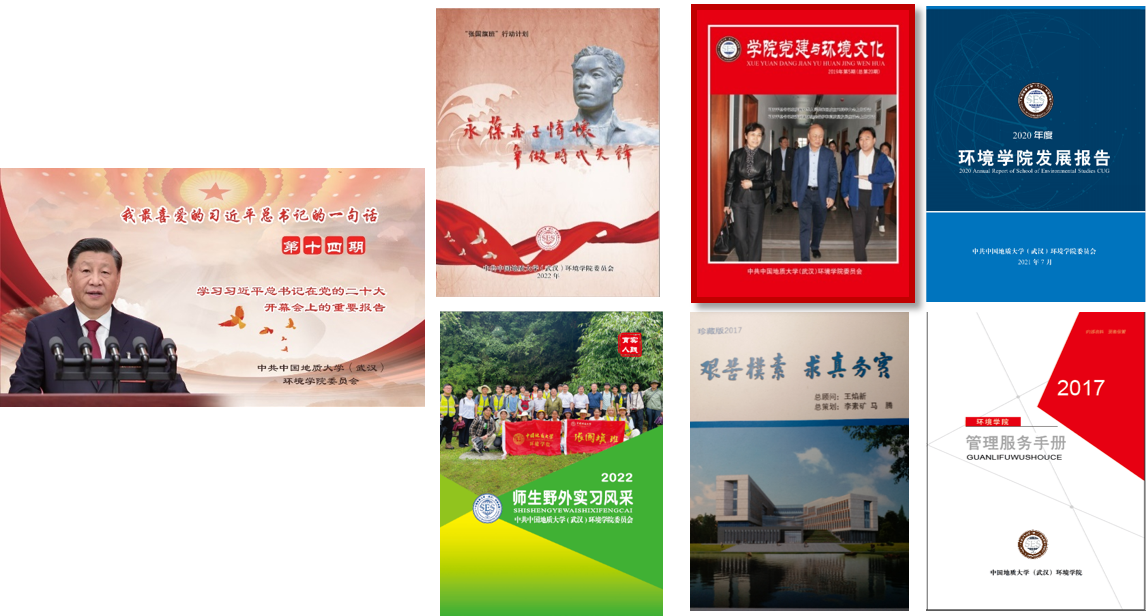 环境学院党委开发了《我最喜爱的习近平总书记的一句话》名信片、院刊《学院党建与环境文化》、院歌《艰苦朴素 求真务实》《环境学院发展报告》《师生野外实习风采展》《“张国旗班”行动计划画册》和《管理服务手册》等“1+6”党建文化产品。“小水滴”、小E在线网络平台、小E有约、“E师亦友”师生茶话会与师生朝夕相伴。“红山雨”师生合唱团歌声嘹亮、党支部风采大赛精彩纷呈,一大批教师、学生典型涌现,各类竞赛摘金夺银。在党员活动室、谈心室、阅读角随处可见环境学子学习身影,环境文化积极健康向上。