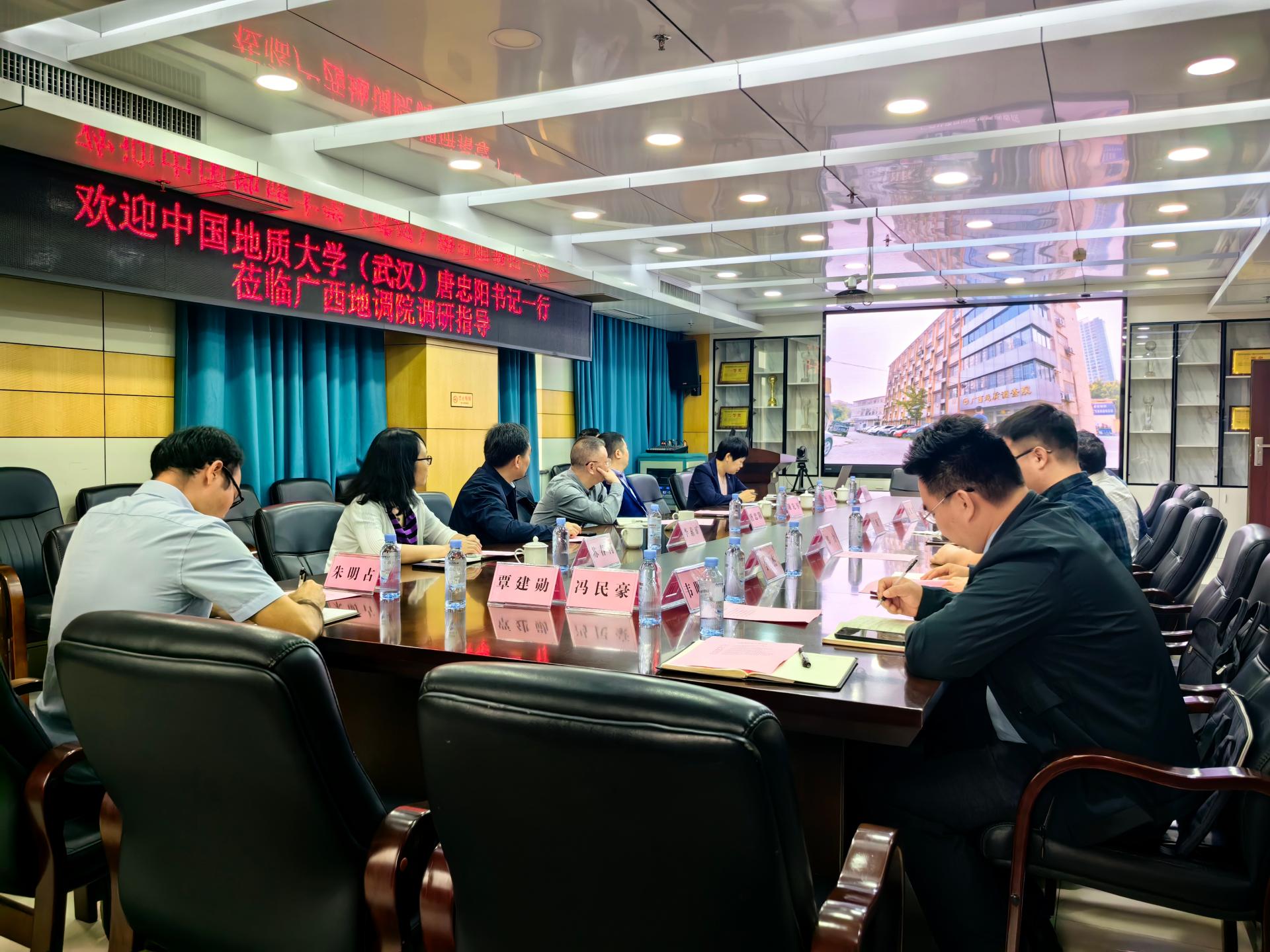 12日上午,调研组来到广西地矿局,与局长唐善茂进行会谈。随后前往广西地调院调研交流,广西地调院院长王新宇、副院长吴天生及相关处室负责人参加。王新宇感谢母校来访,对母校在人才培养、科研创新等方面取得的成绩表示祝贺,并介绍了地调院发展情况和今后工作设想。他希望,能与学校进一步加强科技项目合作,共建科技平台,优化人才队伍建设,实现双方互利共赢。唐忠阳表示,校友是学校宝贵的财富,学校将大力支持广西地调院发展,在人才培养、科学研究、技术支持、队伍提升等方面提供支撑。