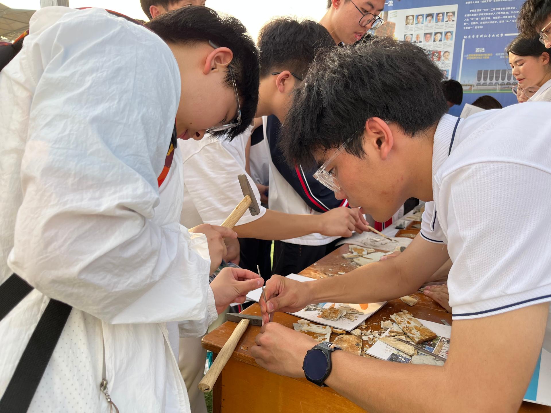 在地球科学学院的展台上,地院学子通过现场教授化石修复方法,让同学们沉浸式体验修复化石的乐趣。他们以精美化石、精美矿物为展品,配上讲解,向参与活动的同学讲述矿物、化石标本特征,分享矿物化石背后的秘密,并指导同学们通过显微镜观看岩石薄片,感受显微尺度的矿物之美,带领同学们品味地学乐趣。