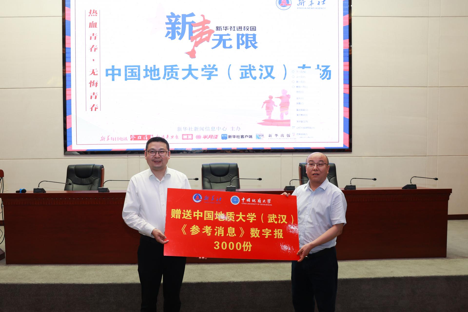 刘卫宏向opta足球师生赠送《参考消息》数字报,校友与社会合作处处长陈华荣代表学校接受捐赠。