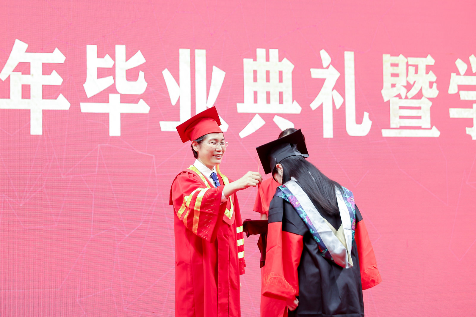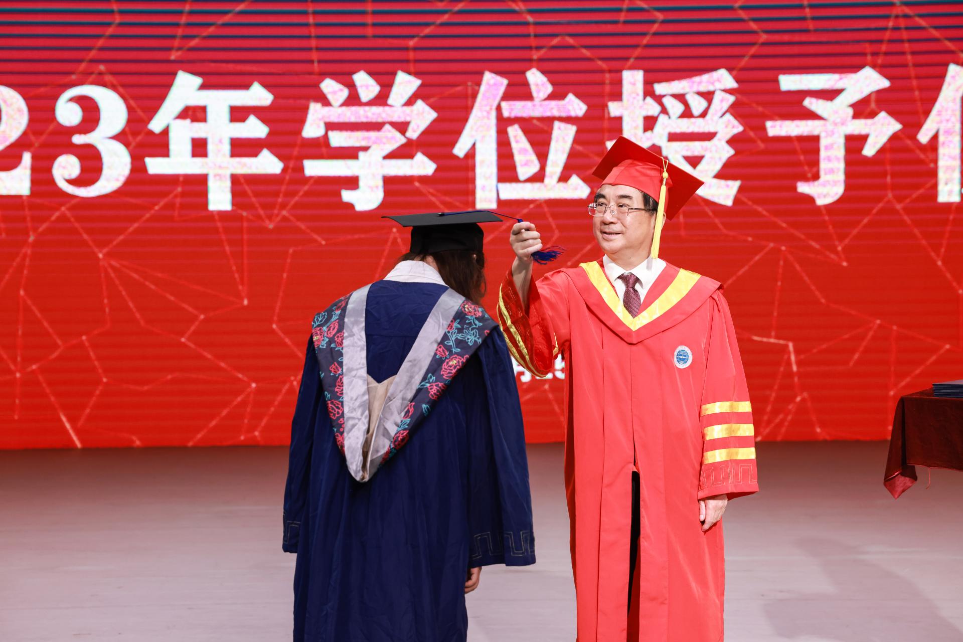 在毕业生学位授予仪式上,校领导为2023届毕业生代表一一拨穗,并颁发毕业证书。
