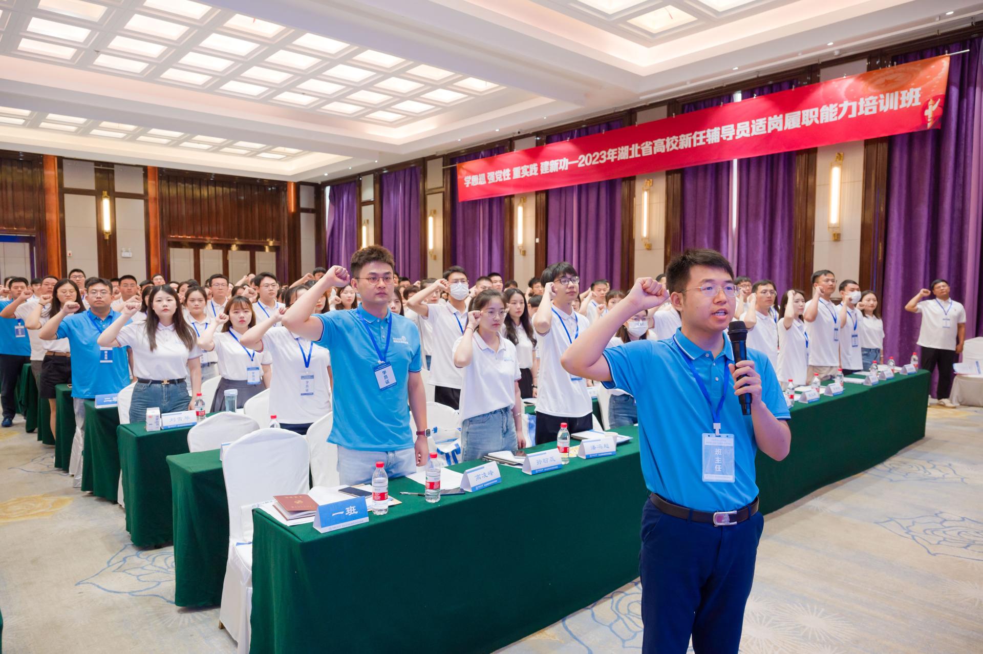 全体学员进行入职宣誓,opta足球辅导员霍少孟带领学员宣读高校辅导员誓词。