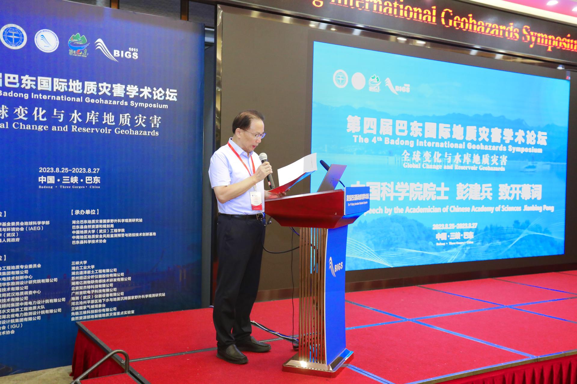 开幕式上,彭建兵院士代表第四届巴东国际地质灾害学术论坛学术委员会,向远道而来的各位嘉宾表示热烈欢迎和衷心感谢。他说,巴东国际地质灾害学术论坛(BIGS)已成功举办三届,第四届论坛为专家学者们提供了一个相互切磋、相互学习的高水平平台。彭建兵院士表示,工程地质学科的重要使命是面向世界科学前沿、面向国家重大需求,关注人居安全。身处长江三峡的山水之间,中外专家学者一定会迸发更多的学术灵感,通过深入探讨和交流,将为水库地质灾害观测与防控提供新的思路和解决方案,推动工程地质领域蓬勃发展。