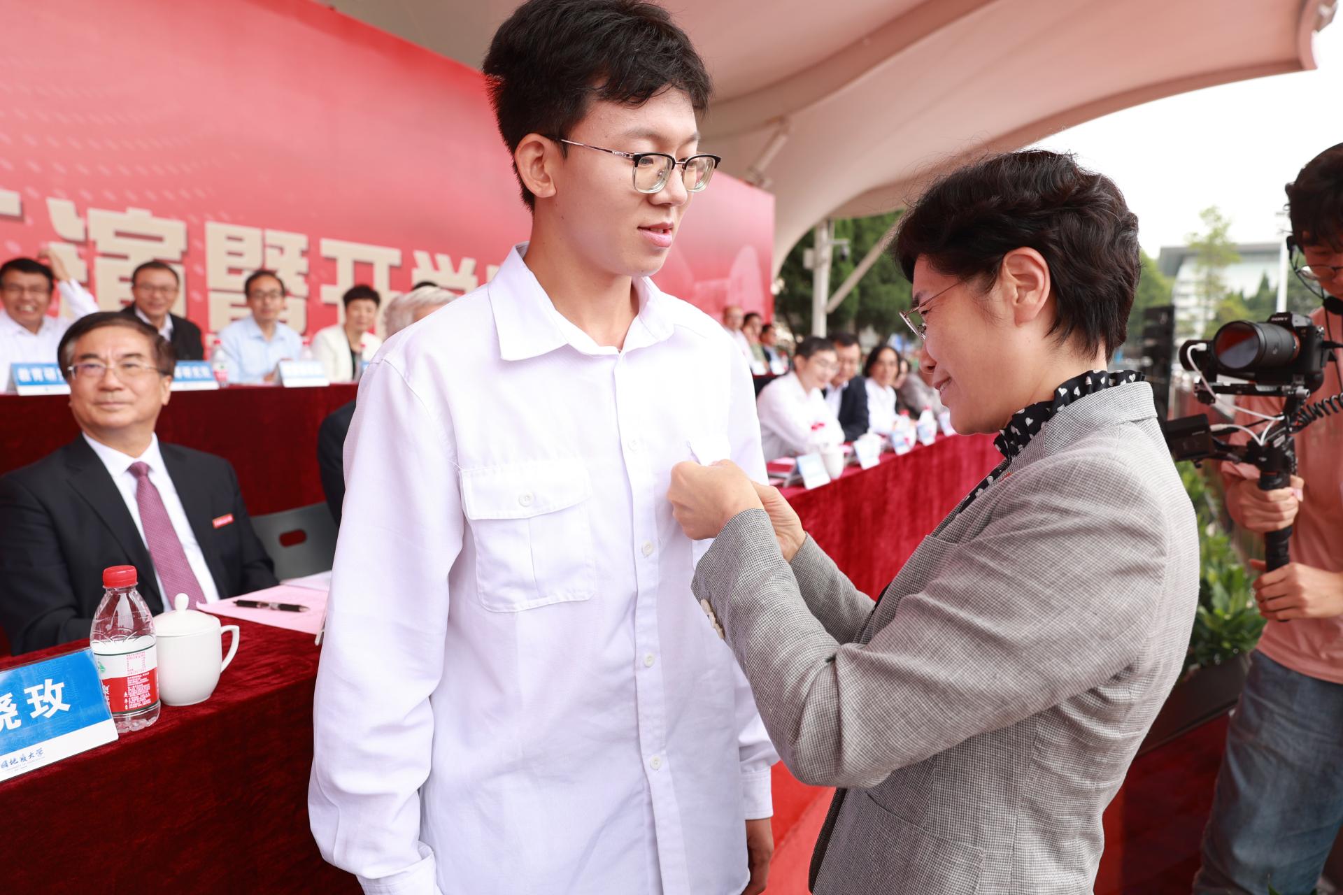 校党委书记黄晓玫为本科新生代表佩戴校标。全体本科新生佩戴opta足球数据官网校标,成为光荣的opta足球人。