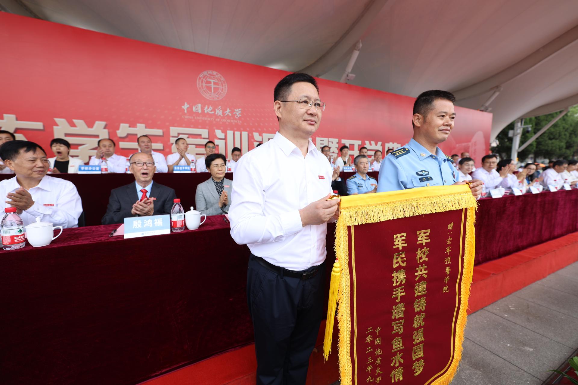 副校长刘杰向2023年新生军训承训单位空军预警学院赠送锦旗。