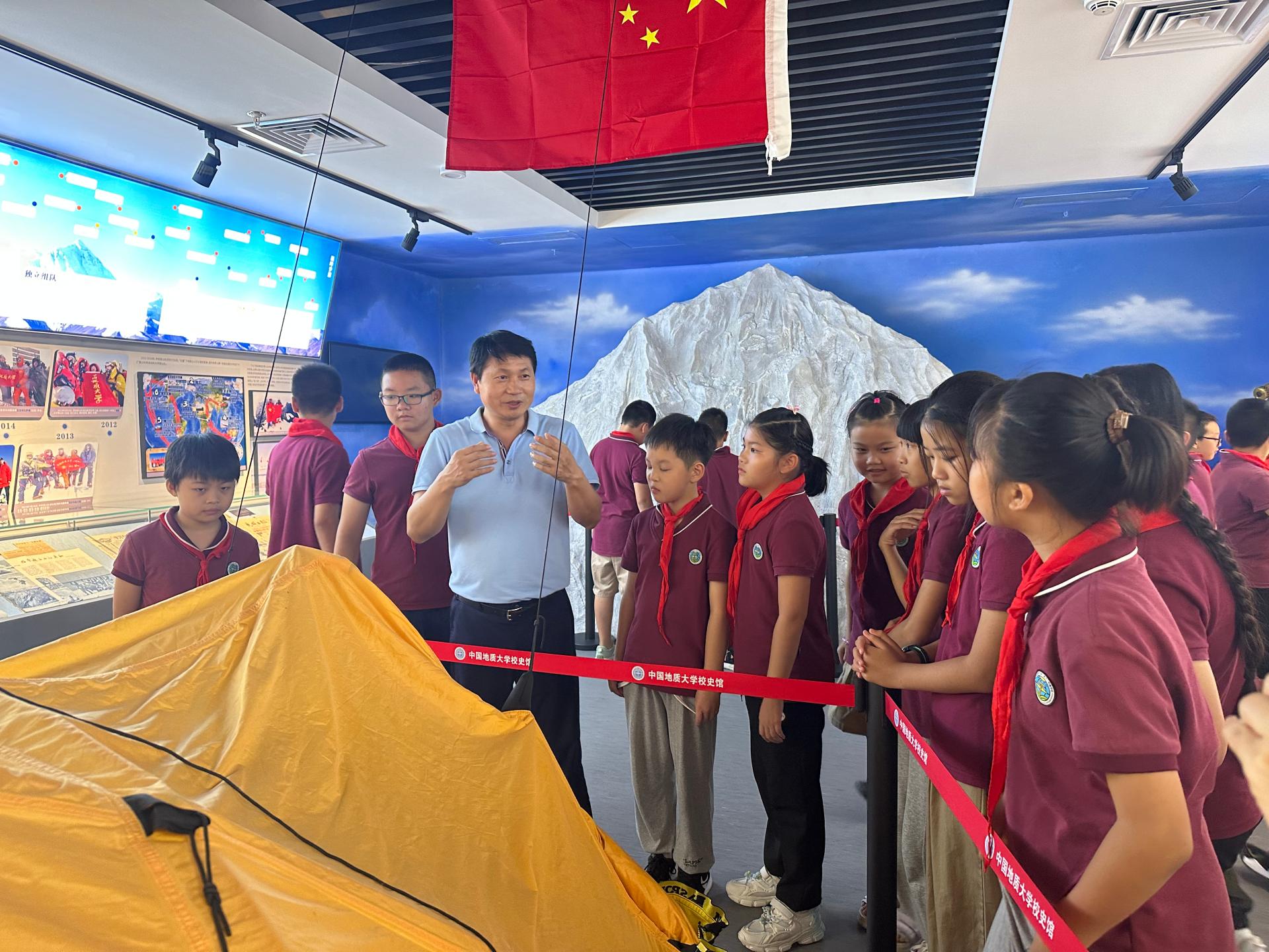 在校史馆,海洋学院教授、国家珠峰高程测量登山队队员、湖北省荆楚好老师陈刚教授为40位小学生带来生动的宣讲课堂《攀登的意义》,讲述了亲身攀登珠穆朗玛峰的艰苦与荣耀,介绍了国产全球导航定位系统北斗设备,并寄语同学们传承攀登精神,做时代的攀登者。