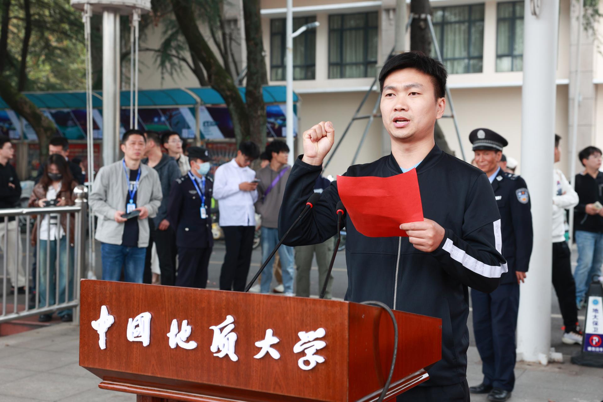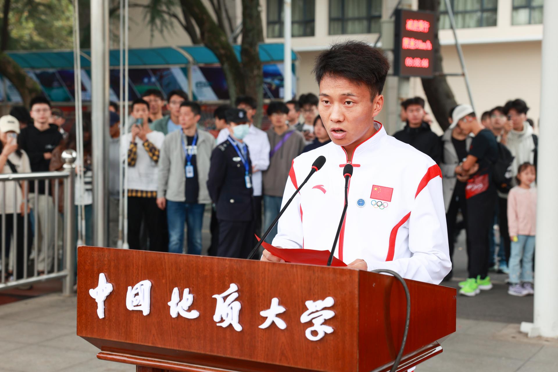 体育学院本科生、杭州亚运会男子马拉松冠军何杰代表学生运动员宣誓。