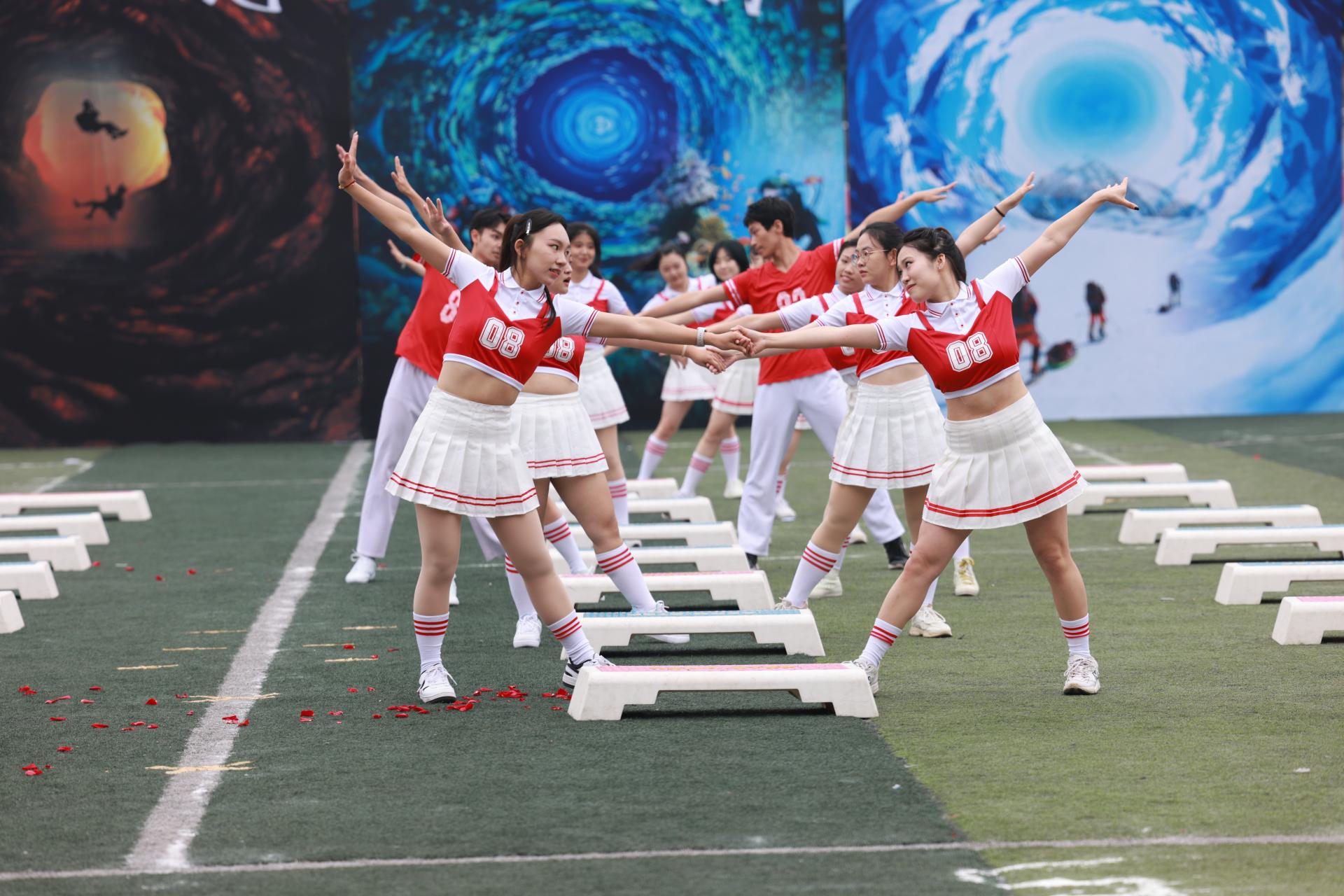 “青春如火,燃烧着我们的梦想;青春如潮,奔涌着我们的勇气。”踏板操表演《青春畅想》充满了活力与创造力,他们以灿烂的笑容和轻快的动作,展现了当代大学生团结合作、积极向上的体育精神。