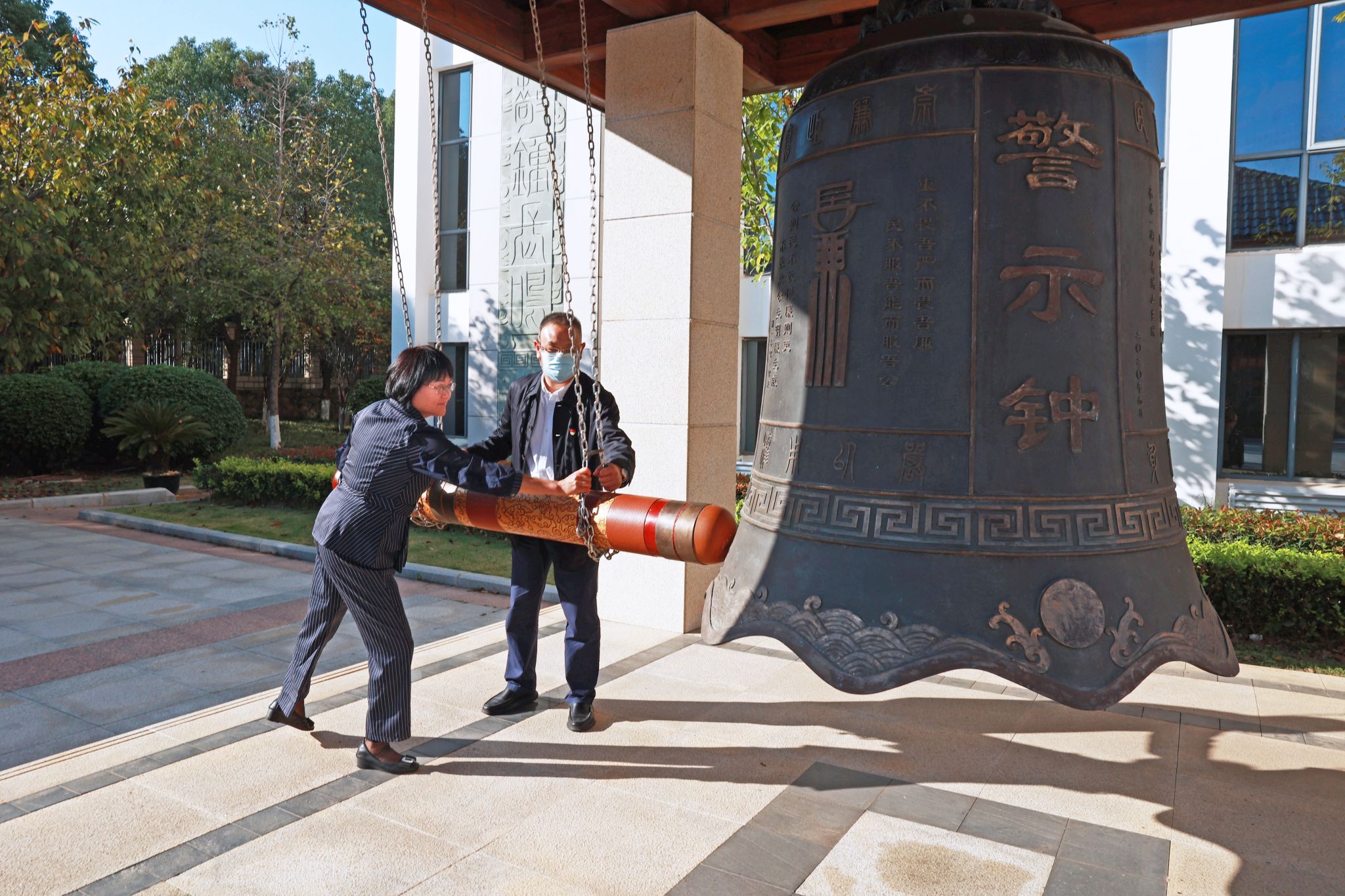 展厅参观结束后,全体干部来到基地廉政文化广场,面向警示钟庄严肃立。唐忠阳、陈文武作为代表,庄重敲响三声廉政警钟,以此警醒全体党员干部要以党纪国法为“准绳”,以反面典型为镜鉴,不断加强党性修炼和自我约束,时刻保持自重自省自警自励,不忘初心、牢记使命,清廉守正、勇毅前行。