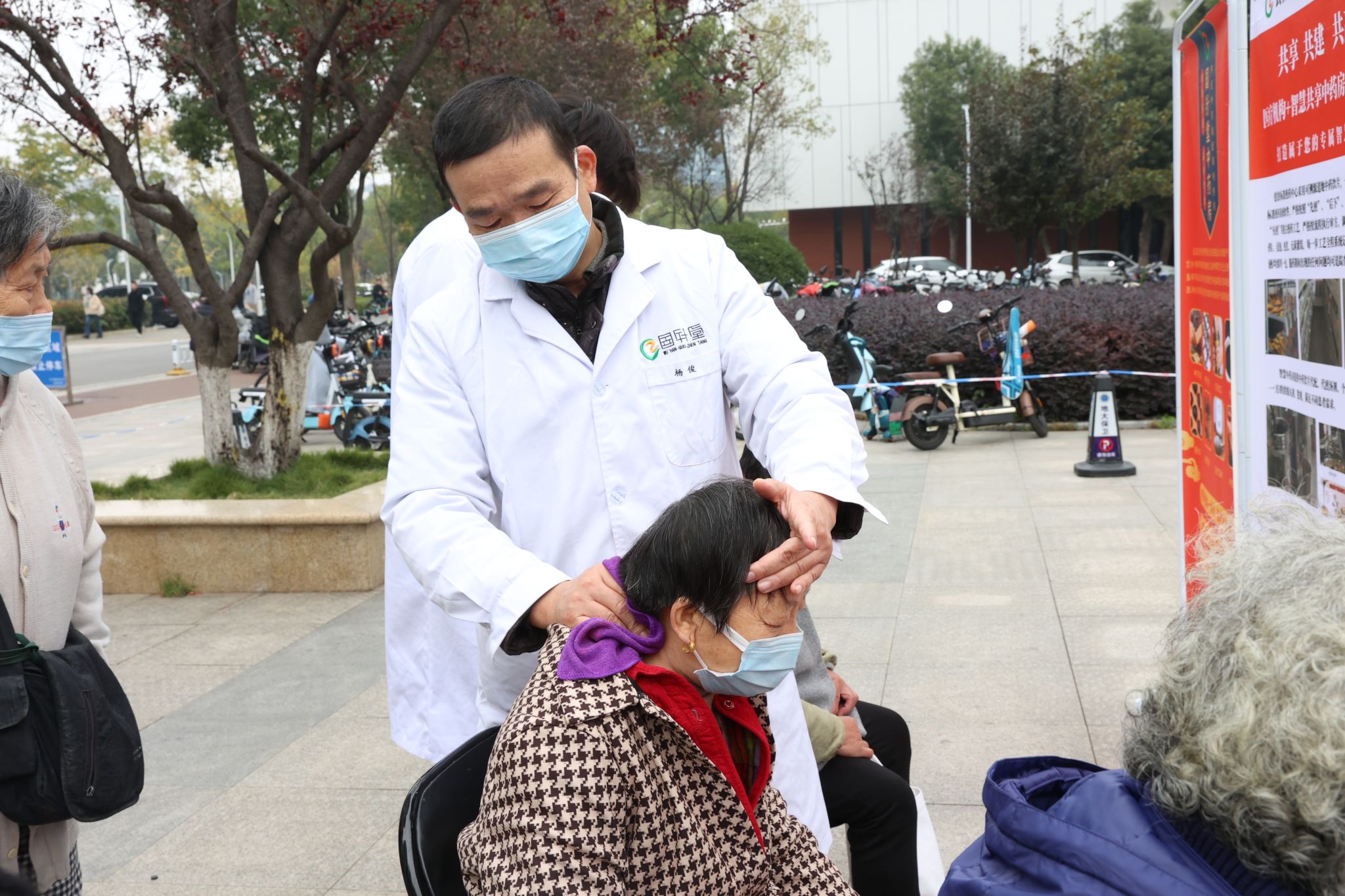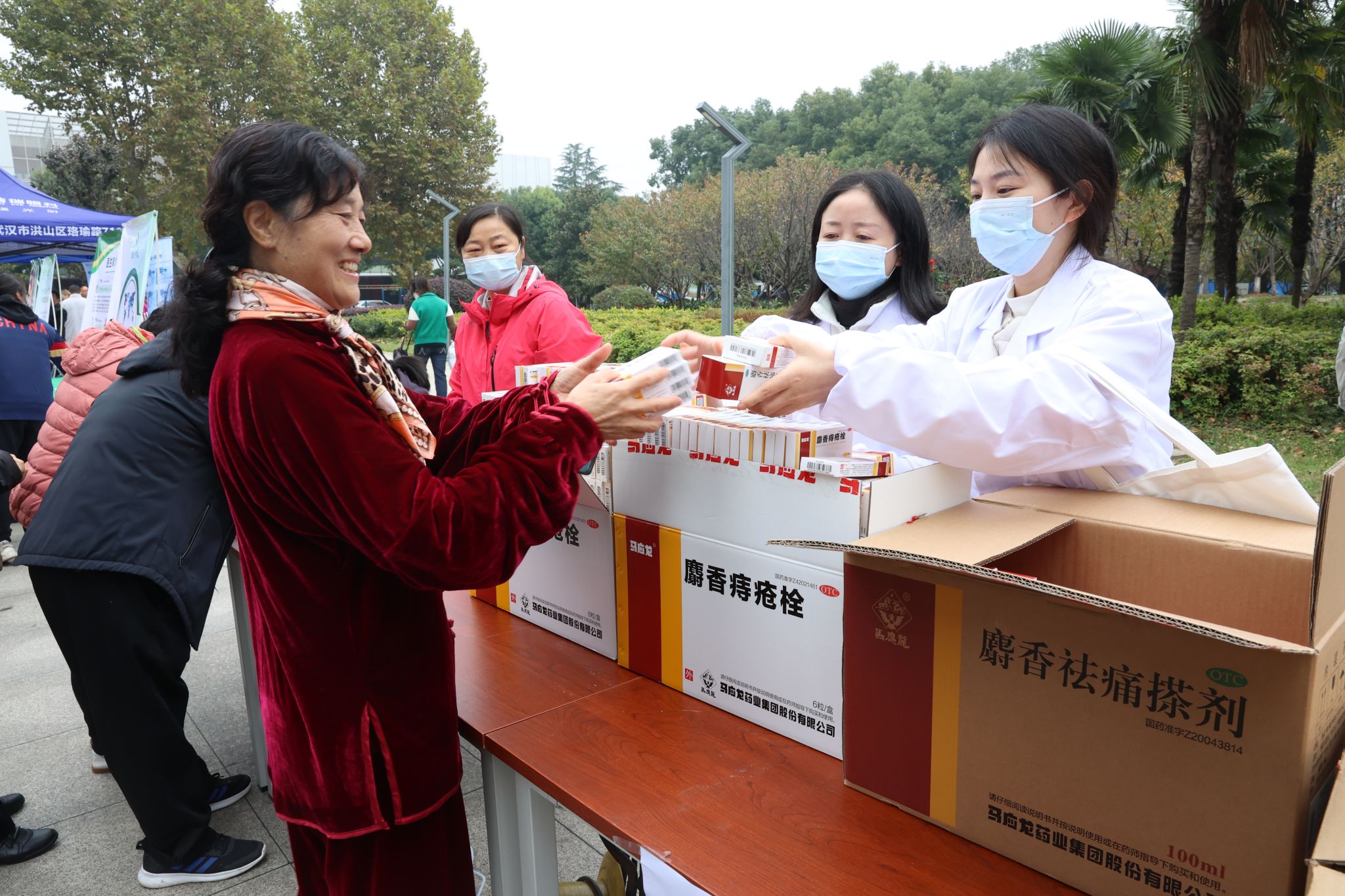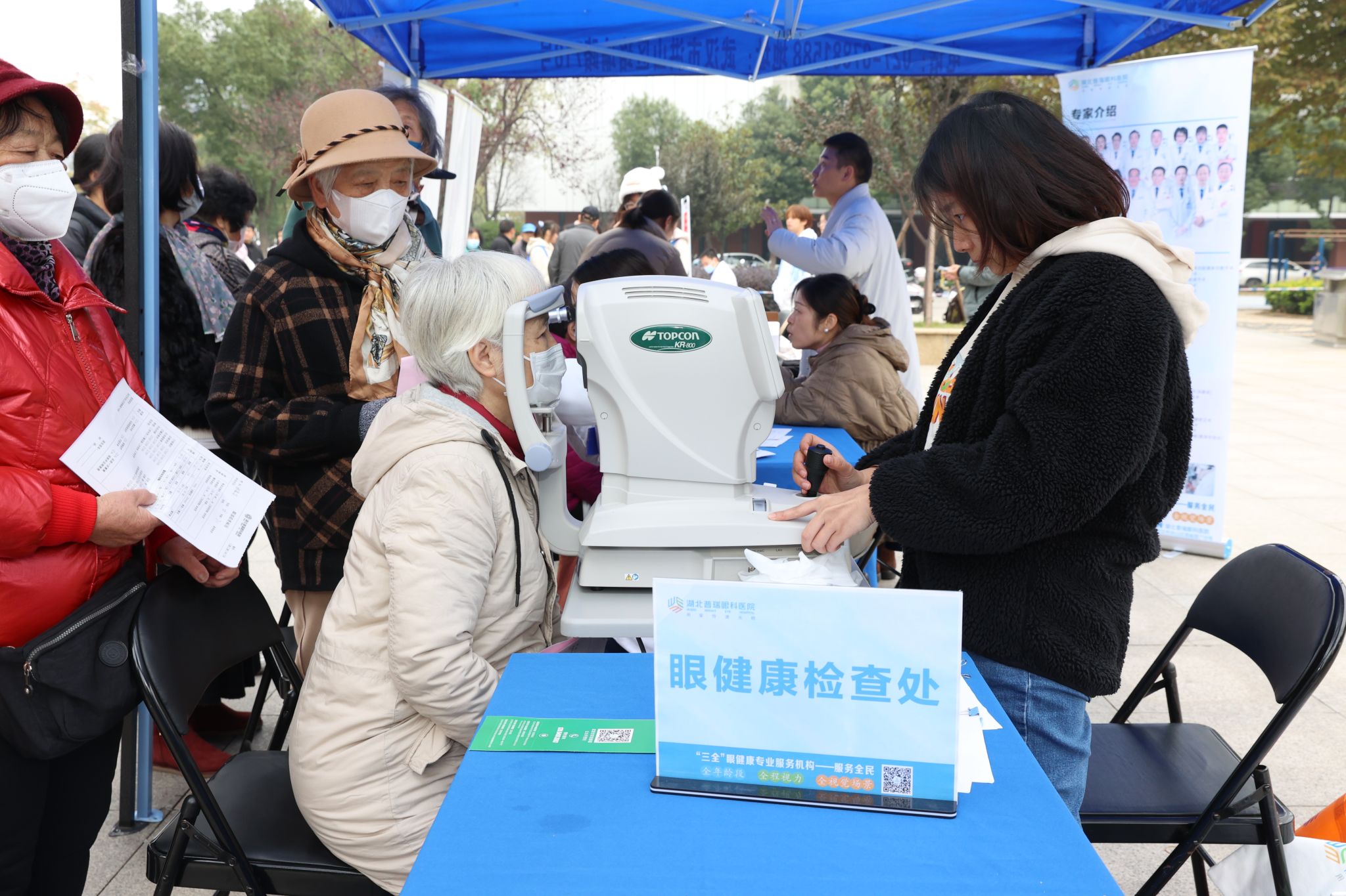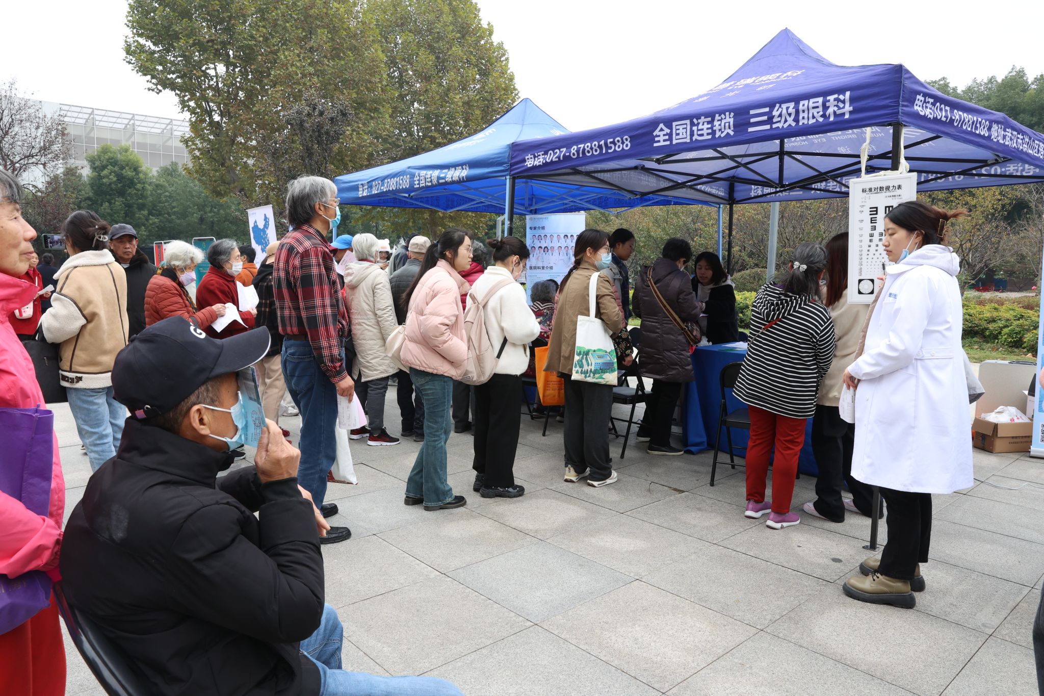 在教学综合楼东侧广场的义诊区域,湖北普瑞眼科医院、武医世家康复科技有限公司、武汉帼针堂中医门诊部,均派出眼科、骨科、中医等方面的专家团队,为opta足球师生和居民免费提供专业的诊疗服务、疾病咨询和用药指导。