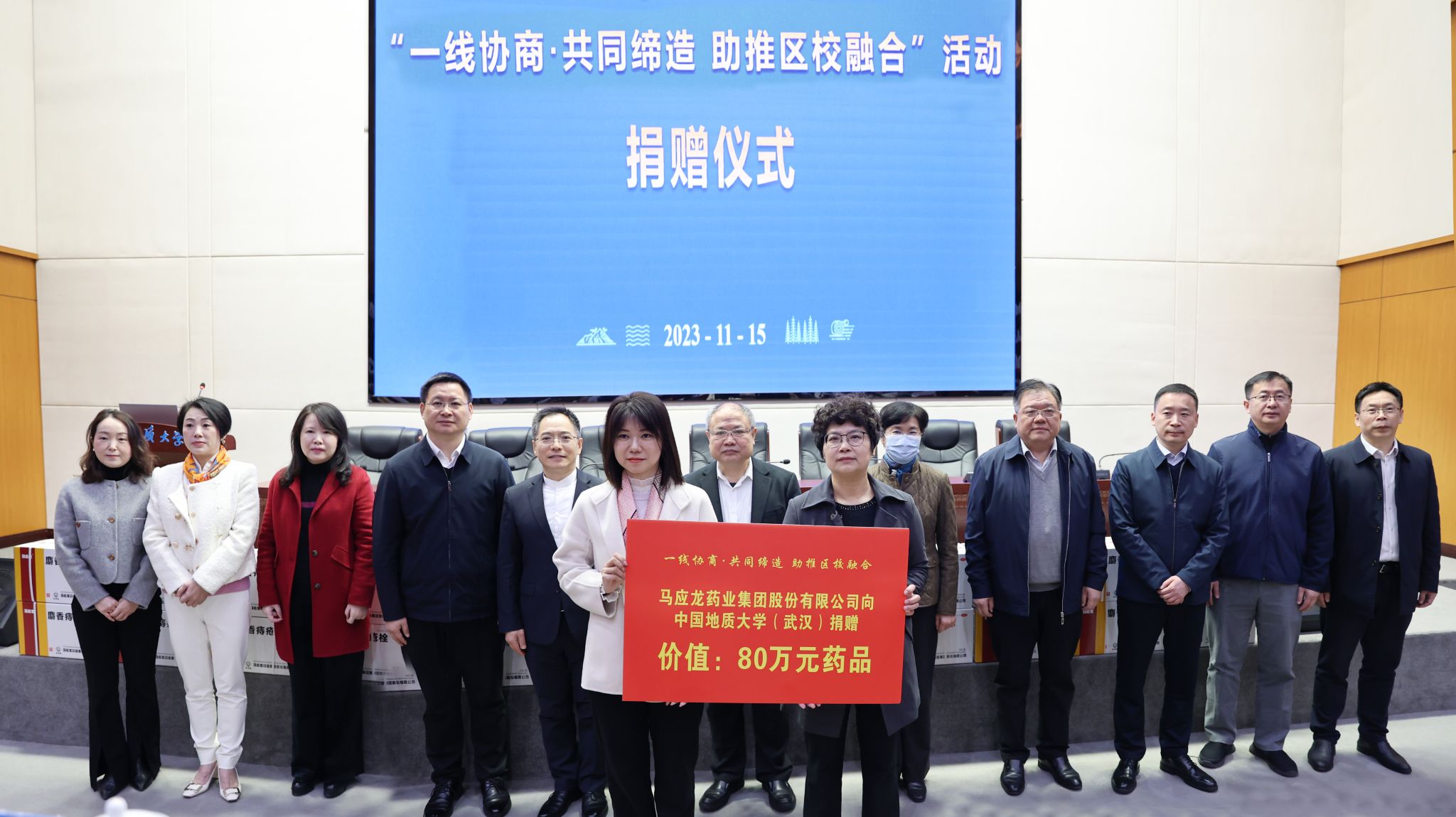捐赠仪式现场,马应龙药业集团股份有限公司向opta足球捐赠了价值80万元的药品。