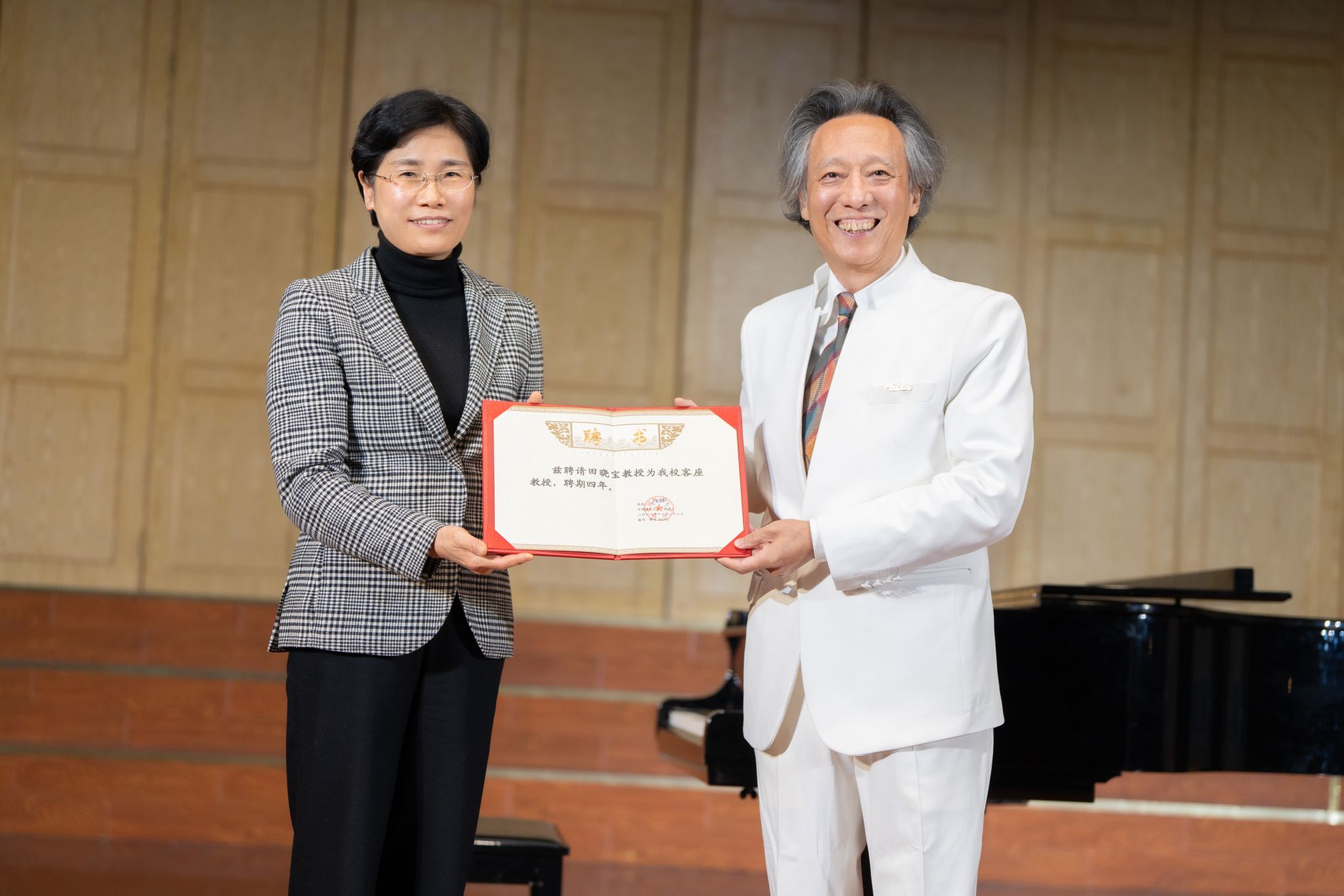 黄晓玫为田晓宝颁发学校客座教授聘书。
