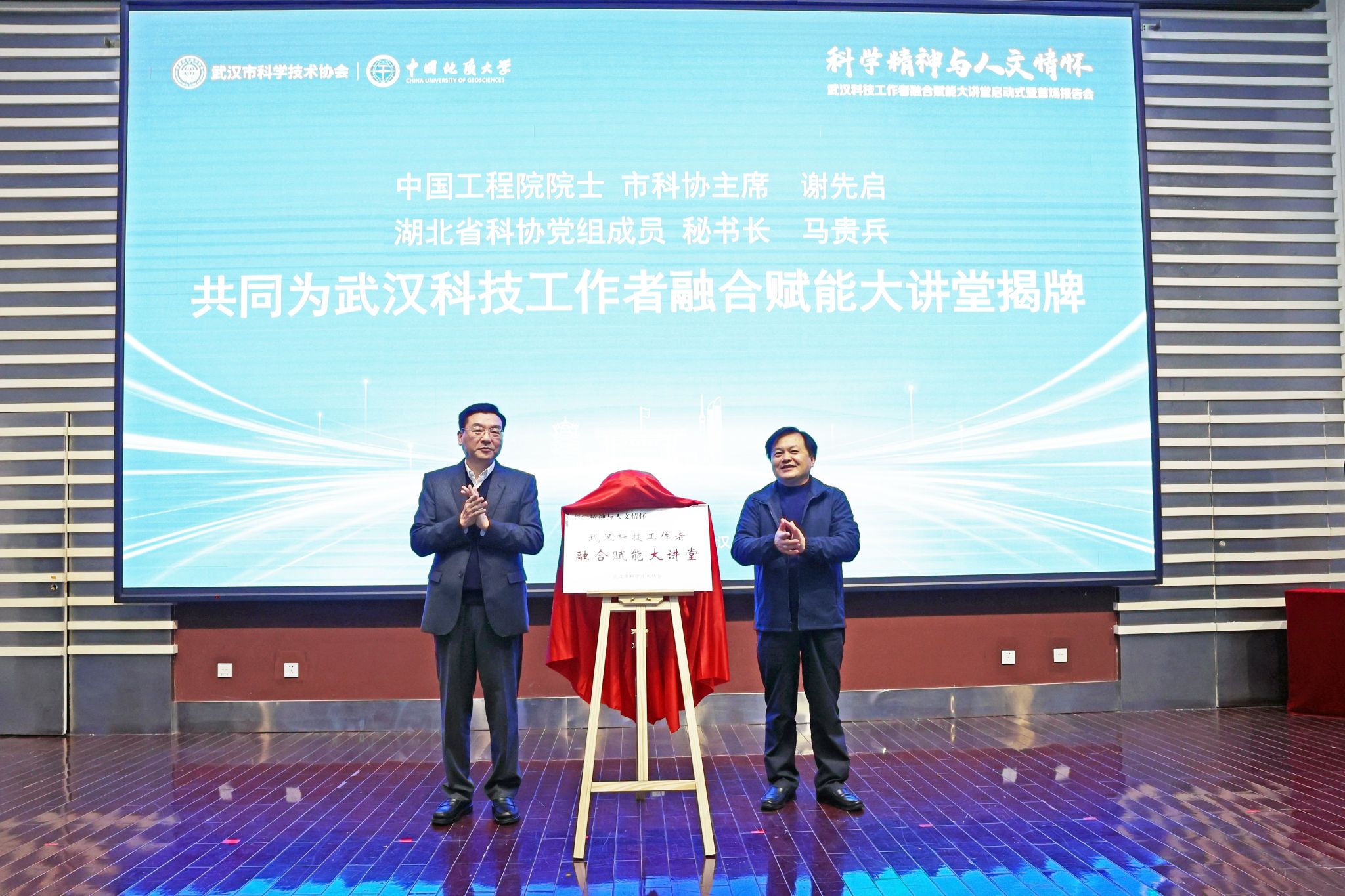 谢先启,湖北省科协党组成员、秘书长马贵兵共同为大讲堂揭牌。