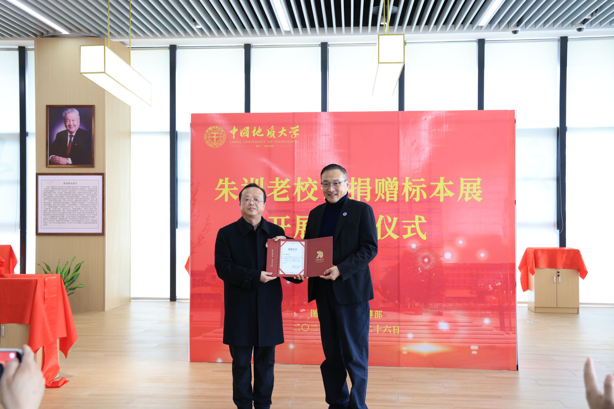 图书档案与文博部部长帅斌向朱宇江颁发学校给朱训老校长的标本捐赠证书。