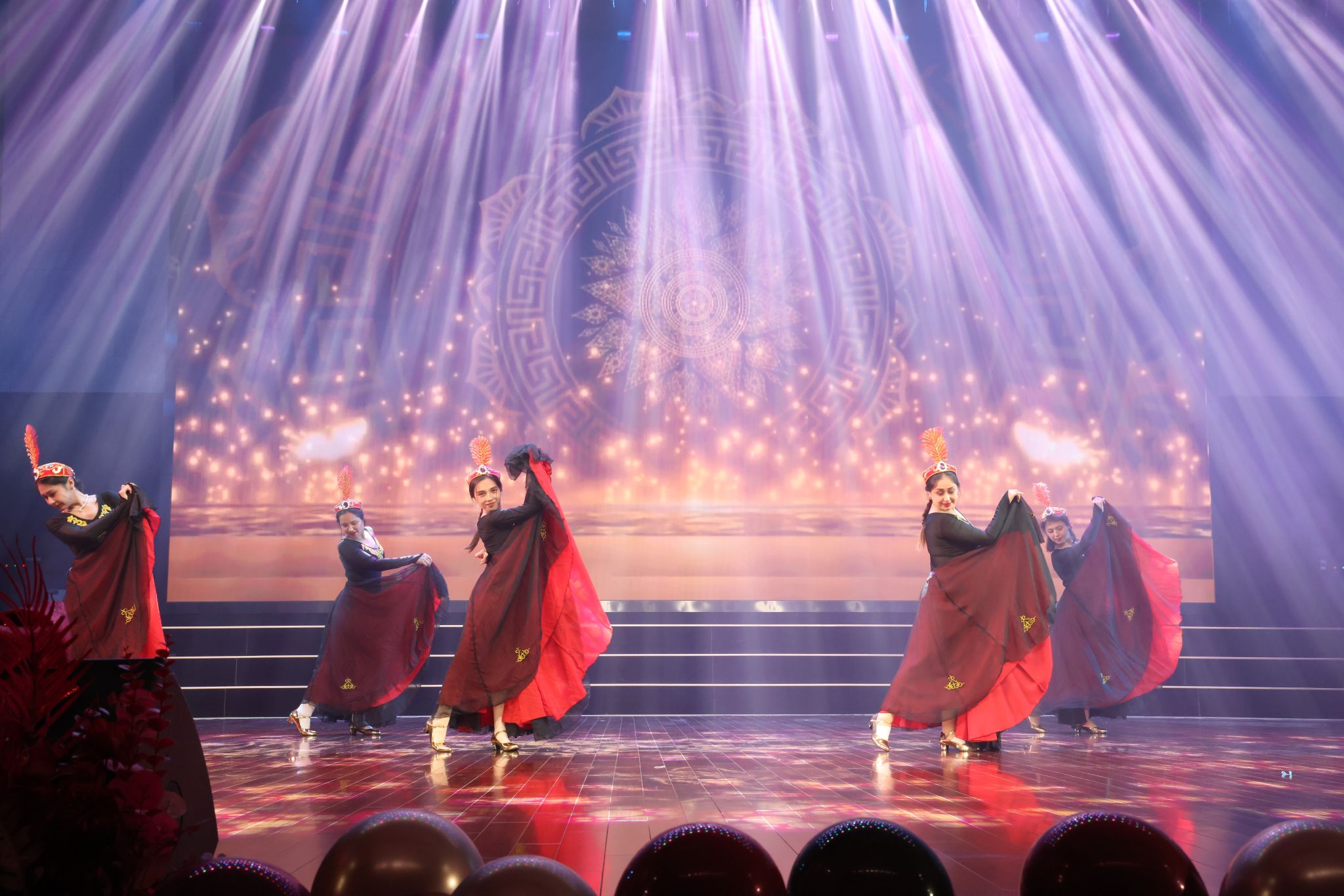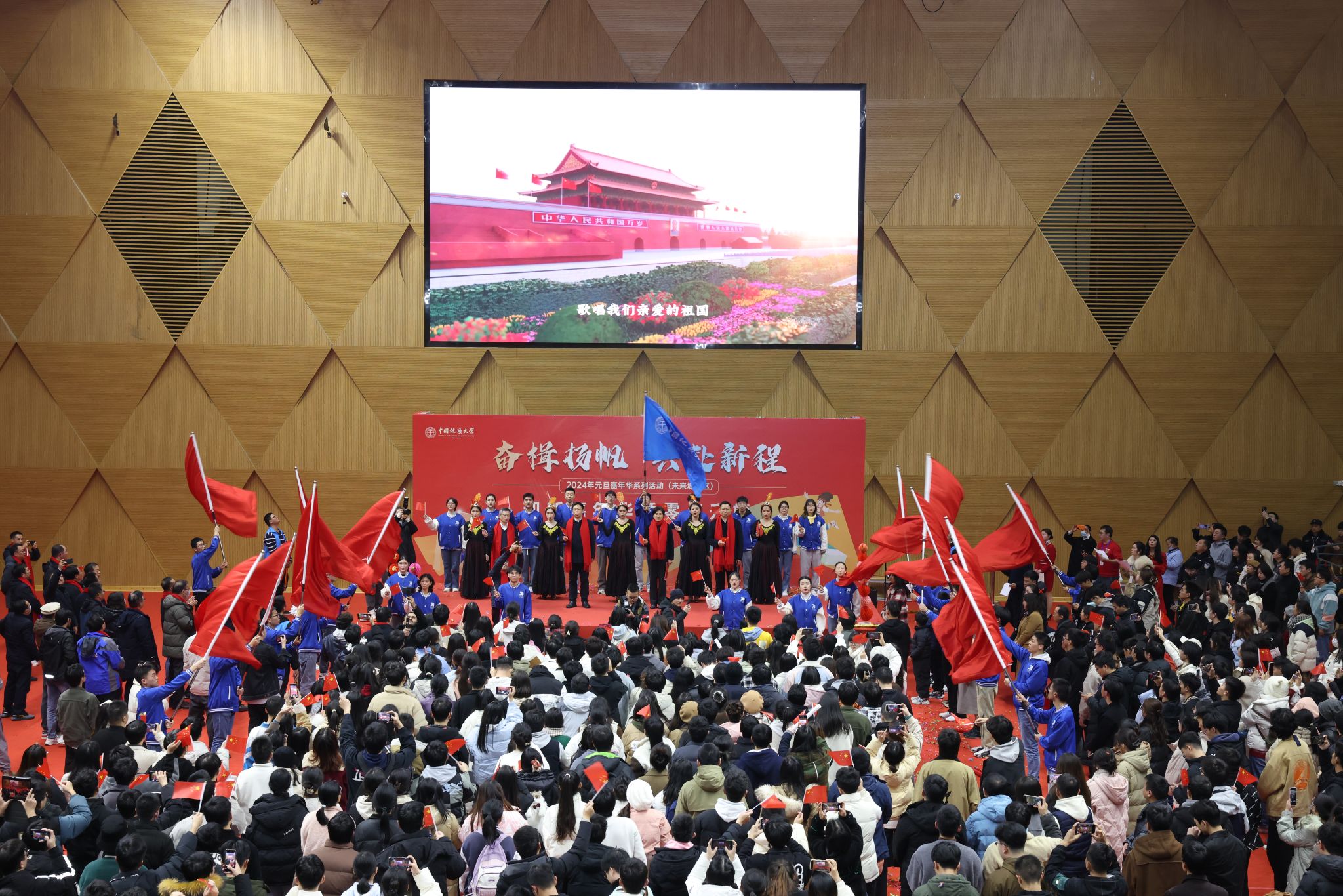 在辞旧迎新之际,两校区50余位民族学生手握红旗,身着民族服饰,与全体师生共同唱响新年第一声《歌唱祖国》,歌声让人心潮澎湃,充满了大家对祖国的自豪和期望。