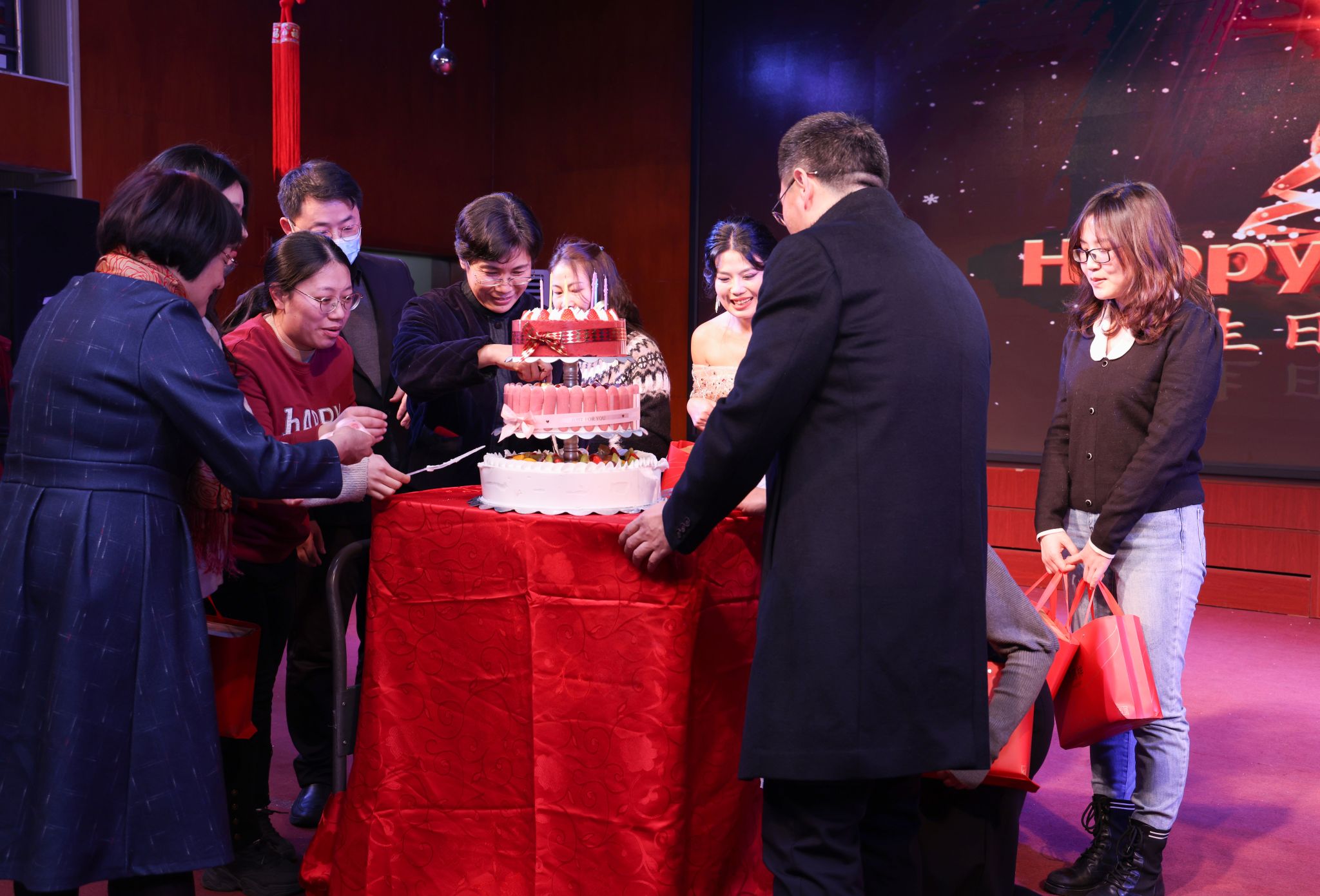集体庆生环节,校领导为六位12月和1月过生日的老师,送上生日礼物,大家一起吹蜡烛、切蛋糕,其乐融融。