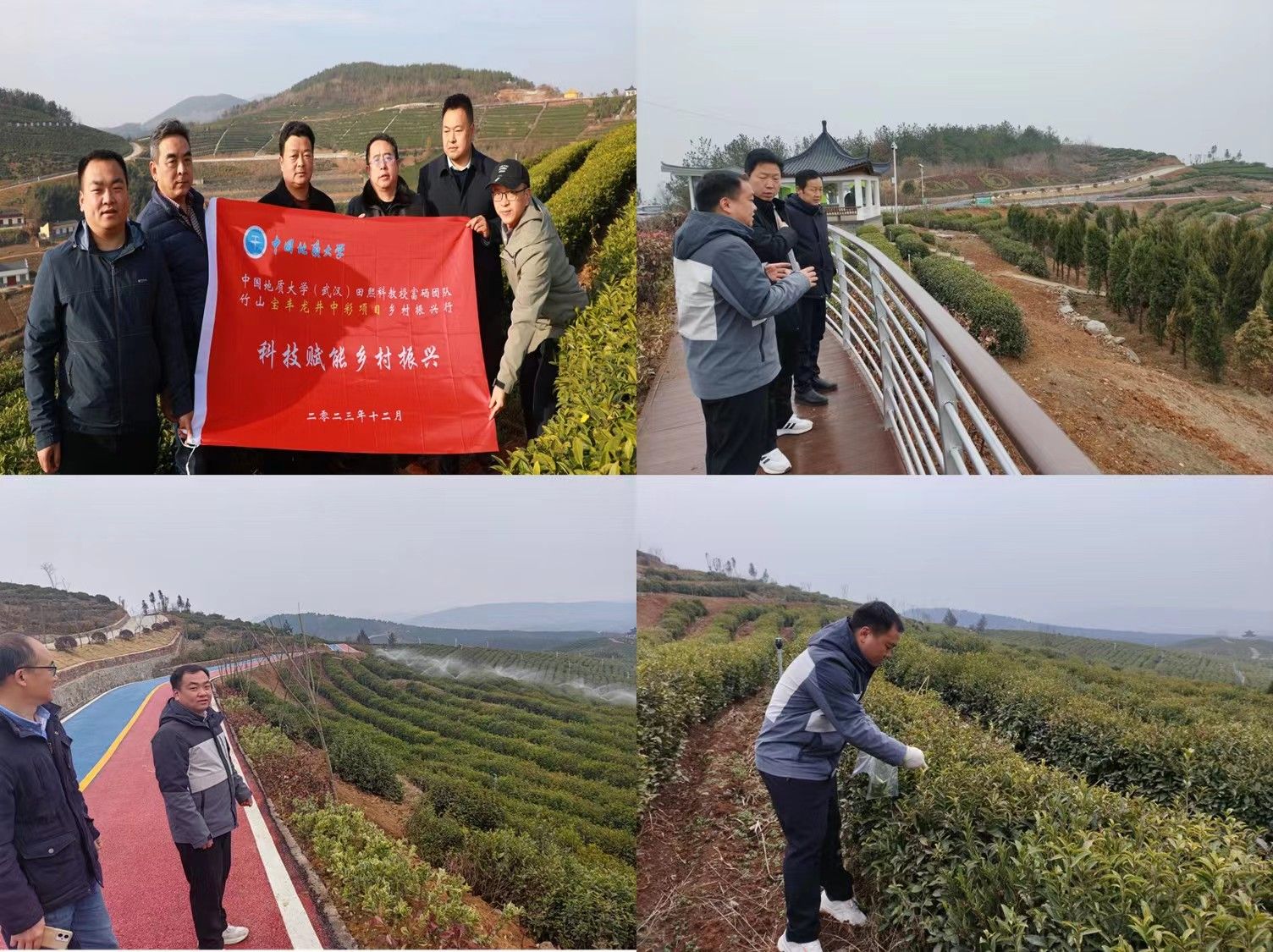 车华超随团队老师前往湖北省竹山县考察“中彩项目”(左上);车华超给宝丰镇领导介绍项目茶园富硒情况(右上);车华超在茶园现场查看施硒作业情况(左下);车华超在茶园采摘样品用于硒含量检测(右下)。