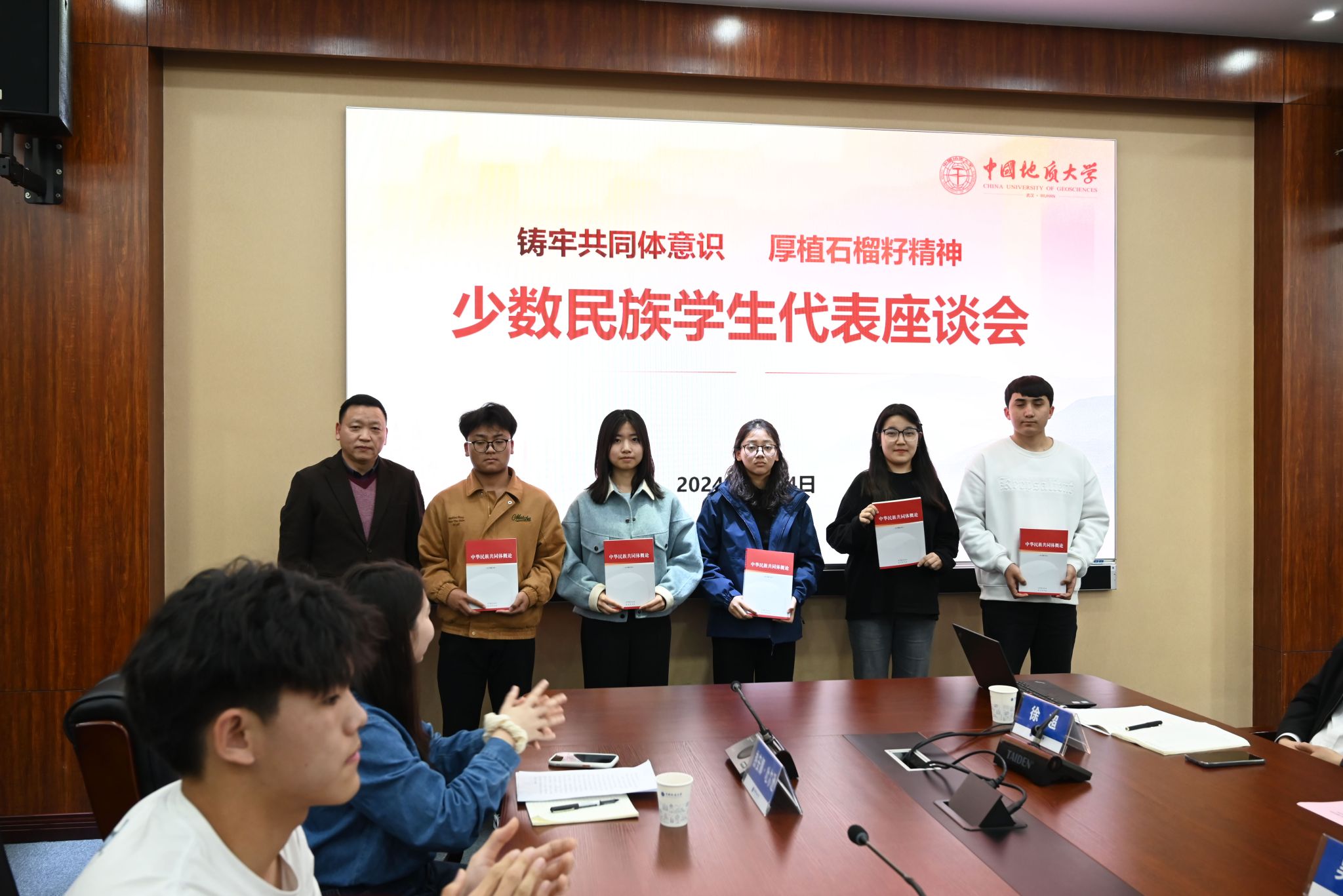王林清向学生代表赠送《中华民族共同体概论》。