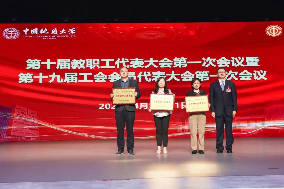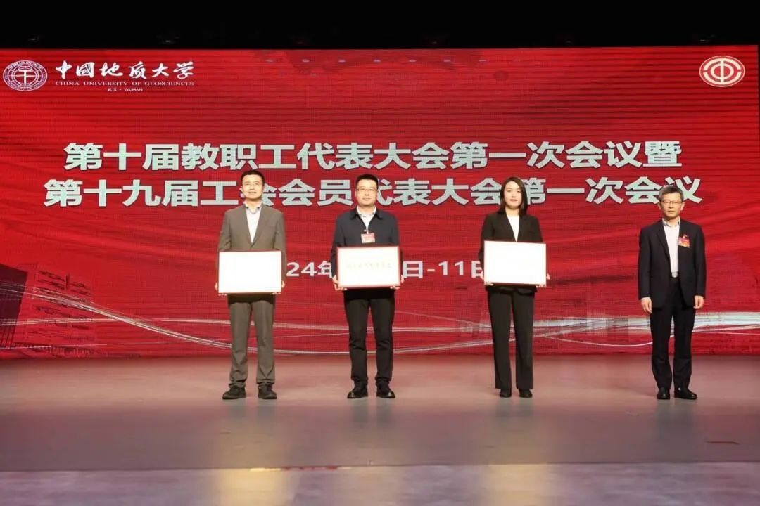 副校长刘杰为九届五次教代会“提案优秀组织单位”颁奖,外国语学院代表团、工程学院代表团、资源学院代表团获得九届五次教代会“提案优秀组织单位”荣誉称号