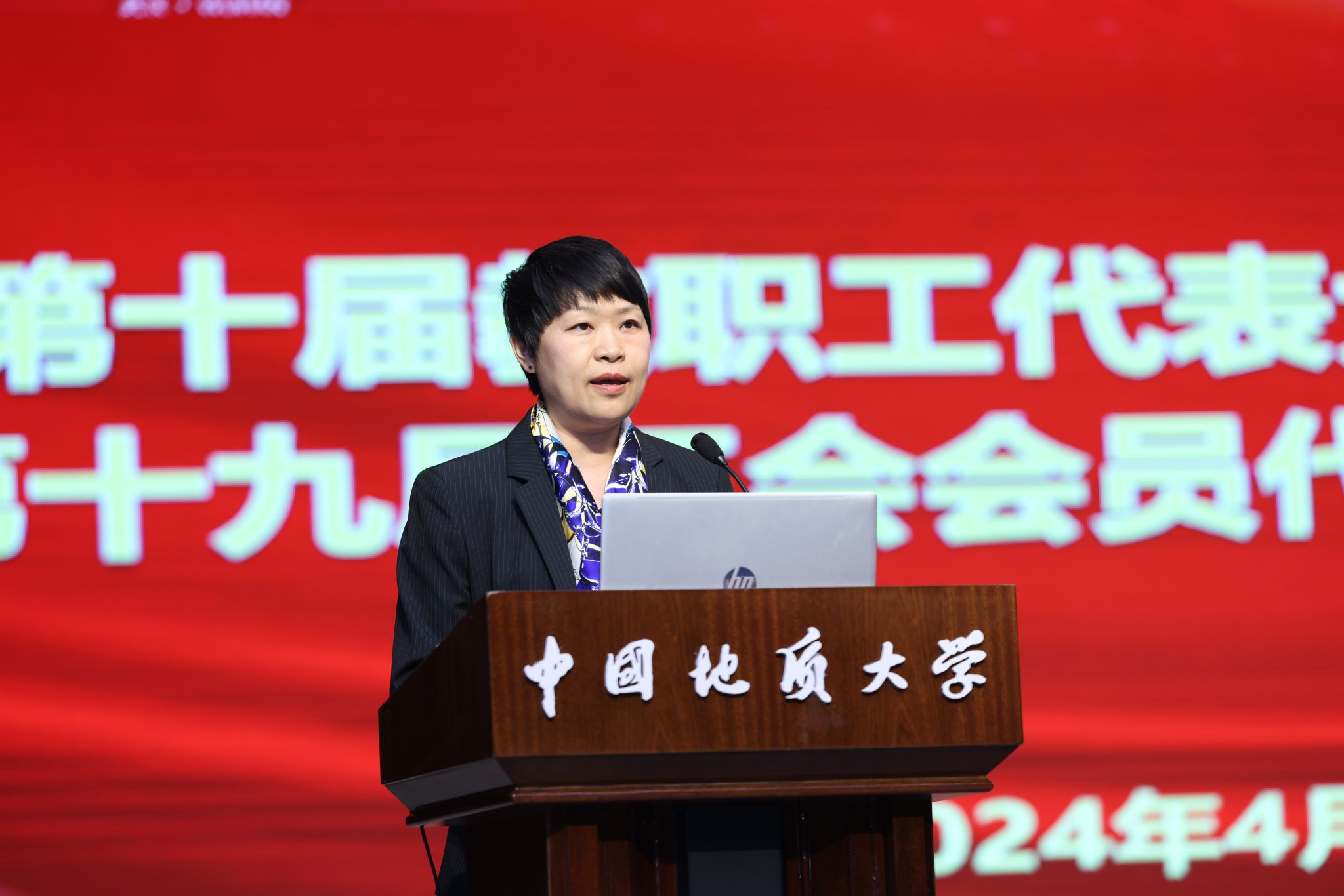 大会副秘书长、工会常务副主席郭秀蓉宣读《关于学校年度工作报告的意见》