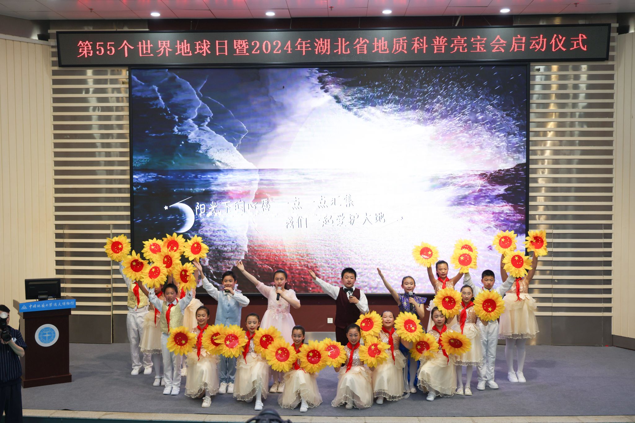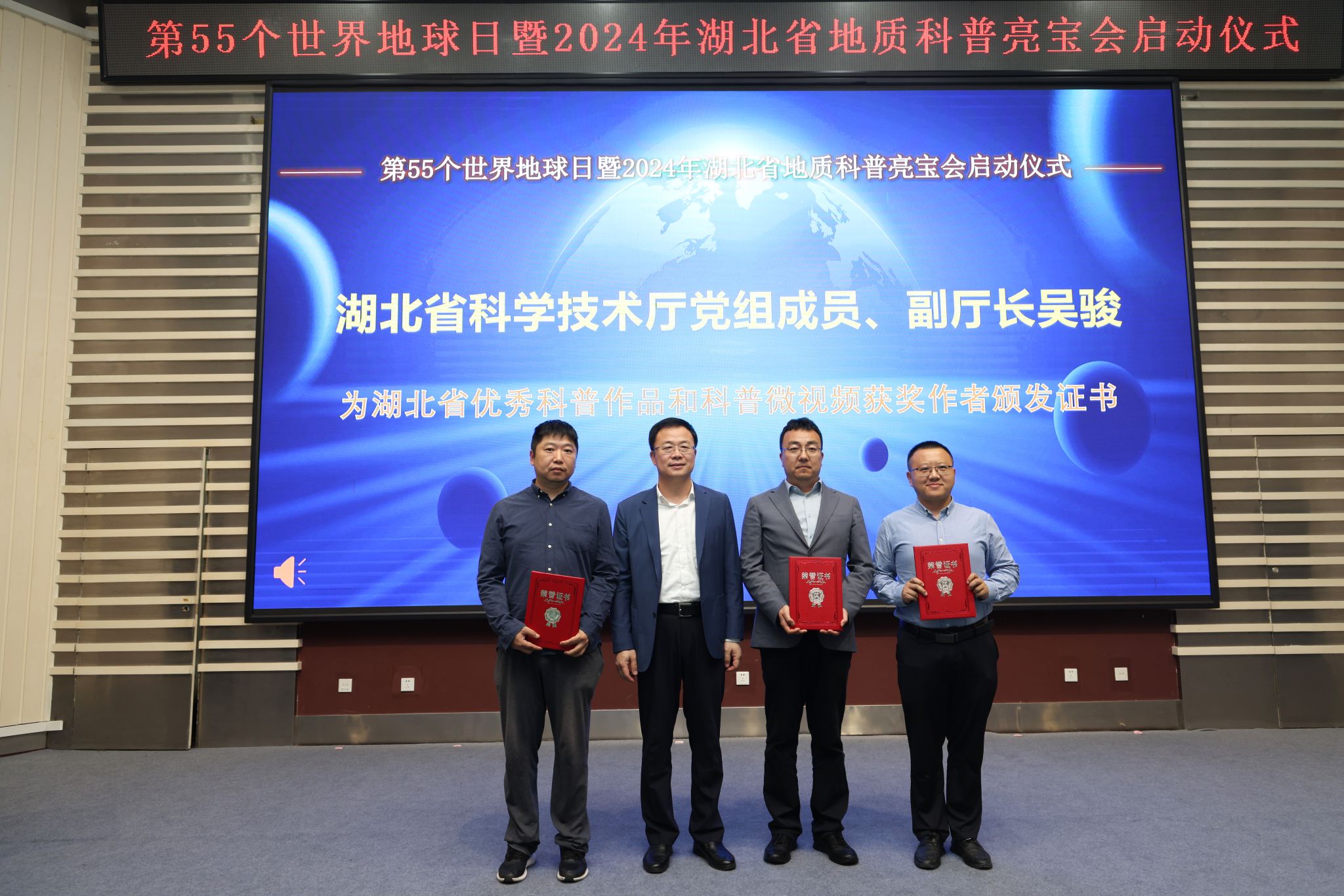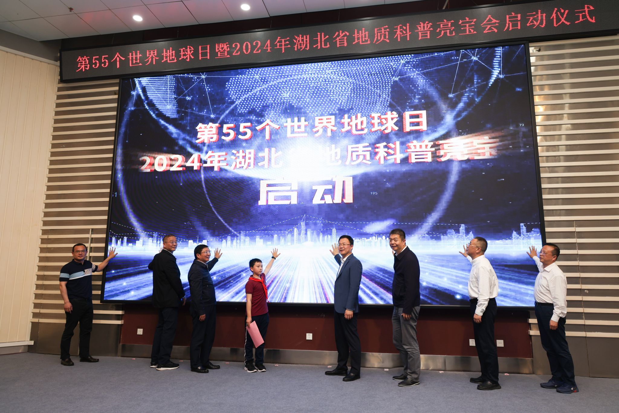 唐忠阳、吴骏、孙建刚、薛明、秦训松、图书档案与文博部部长帅斌、科学技术发展院副院长黄祥嘉及学生代表共同开启屏幕,宣布第55个世界地球日暨2024年湖北省地质科普亮宝会活动正式启动。