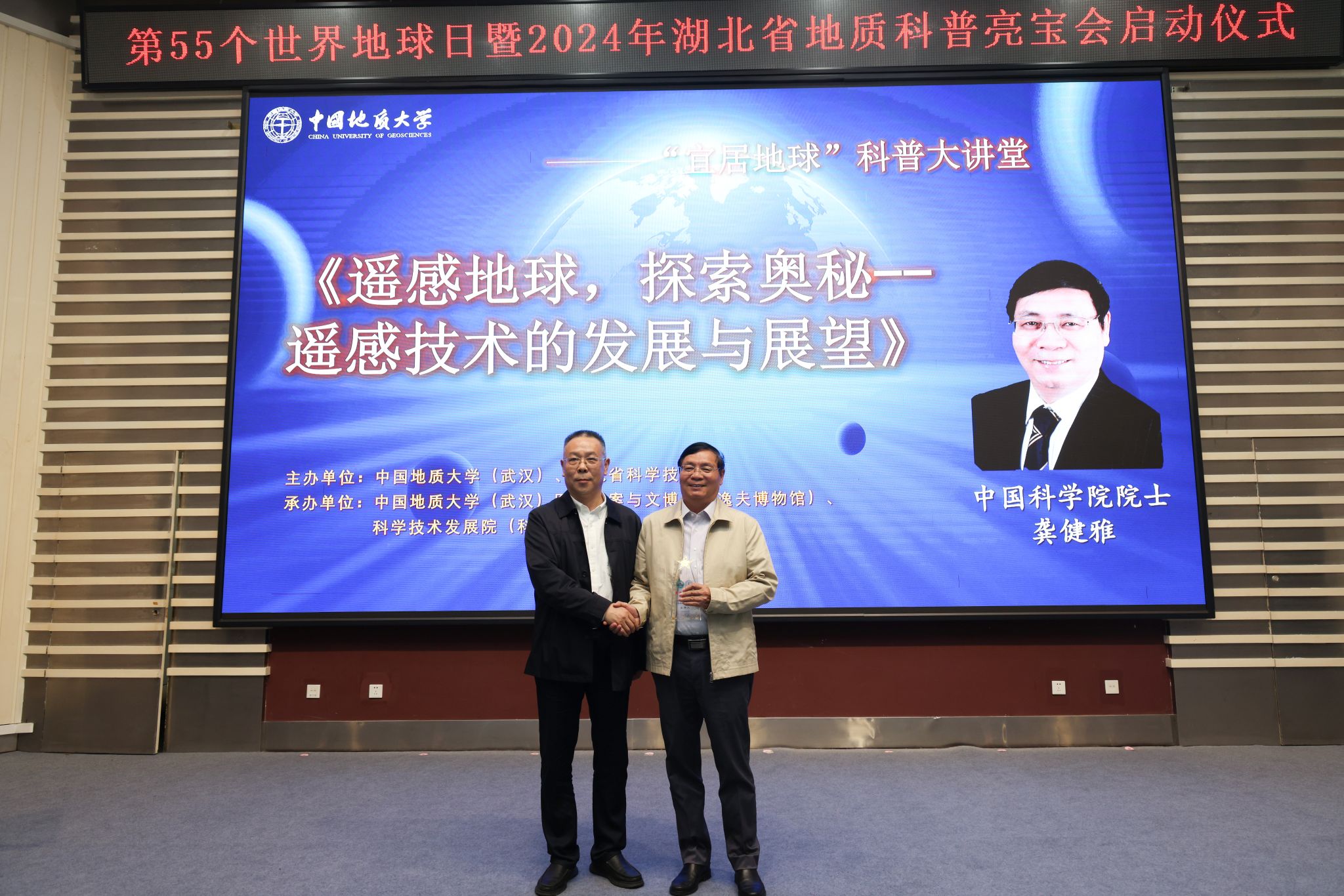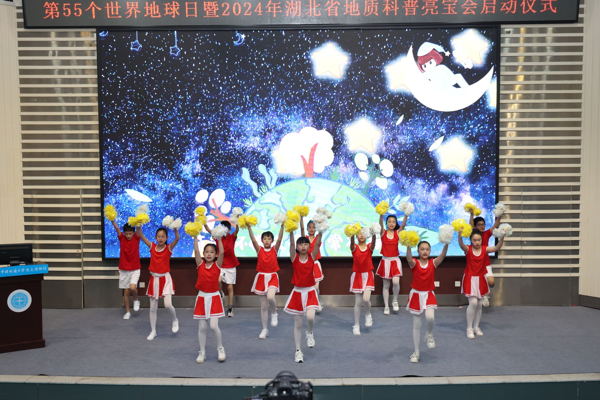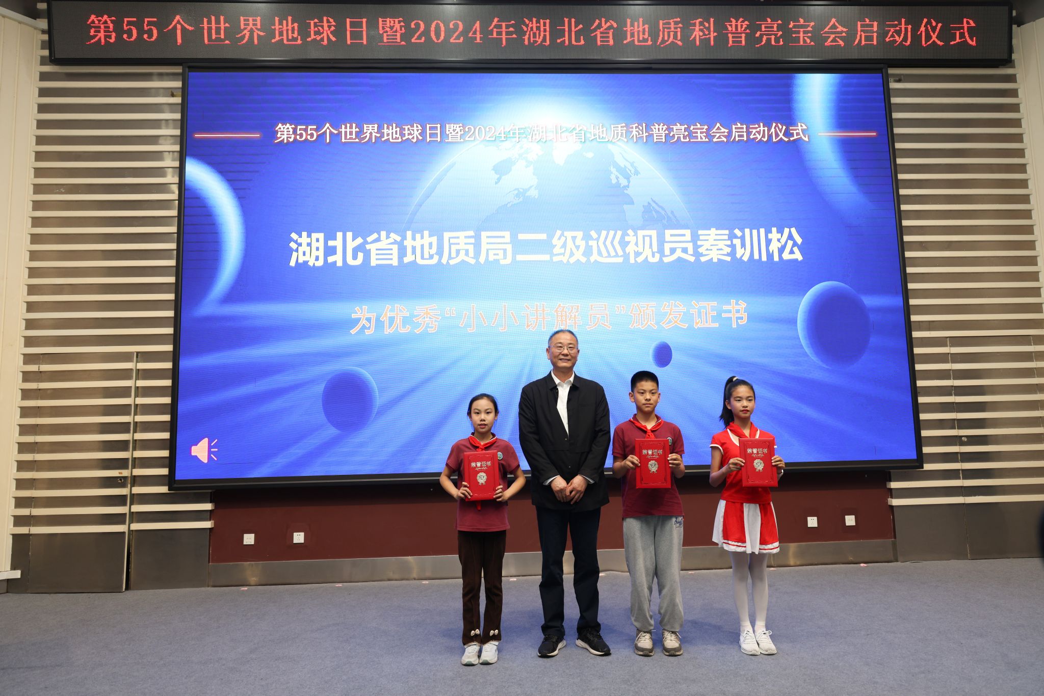 唐忠阳、吴骏、孙建刚、薛明、秦训松、图书档案与文博部部长帅斌、科学技术发展院副院长黄祥嘉及学生代表共同开启屏幕,宣布第55个世界地球日暨2024年湖北省地质科普亮宝会活动正式启动。