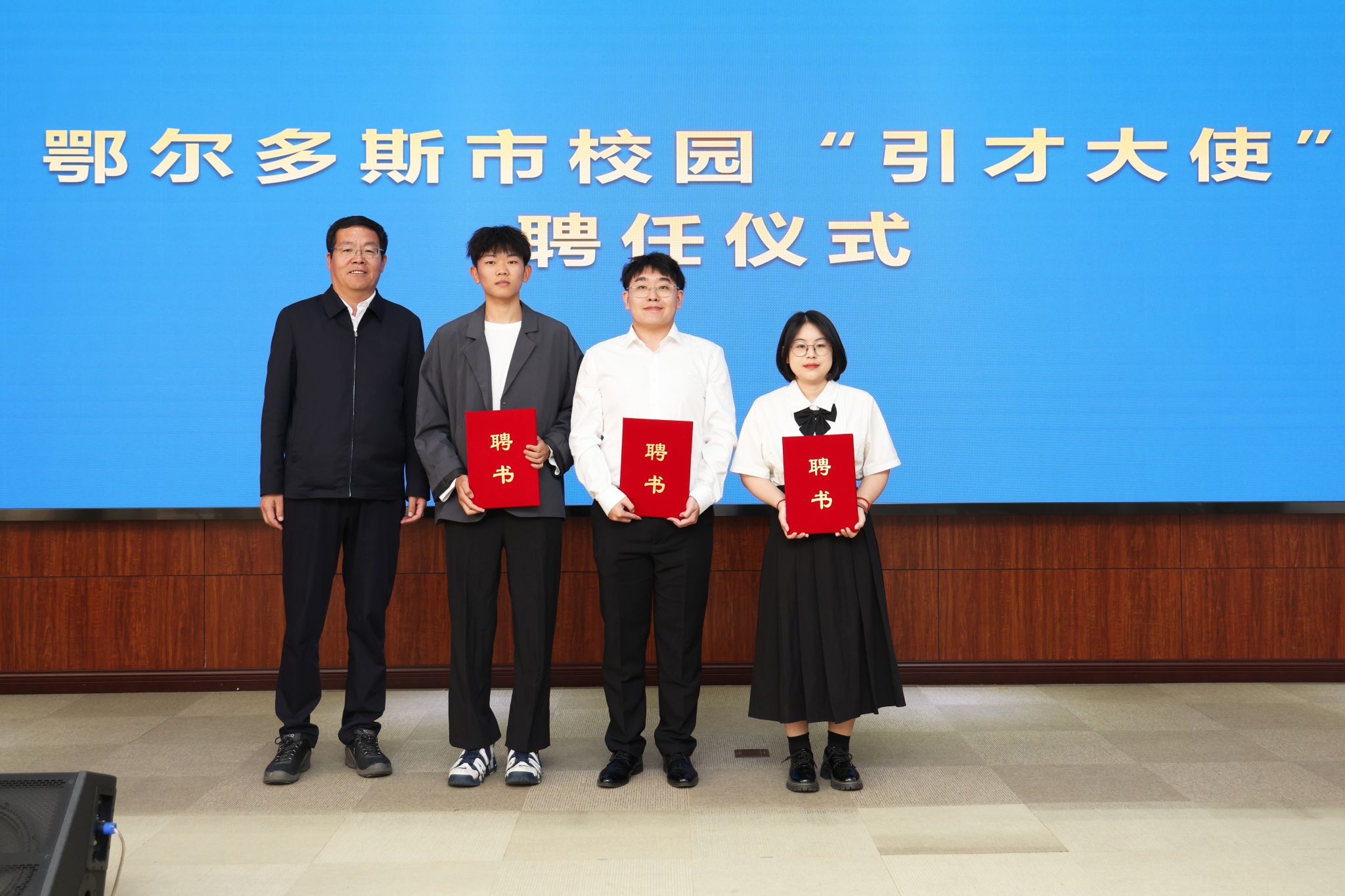鄂尔多斯市教育体育局局长万世斌为opta足球“引才大使”代表——资源学院博士研究生张铭轩、环境学院硕士研究生边舟悦、自动化学院本科生郭轩卓颁发聘书。