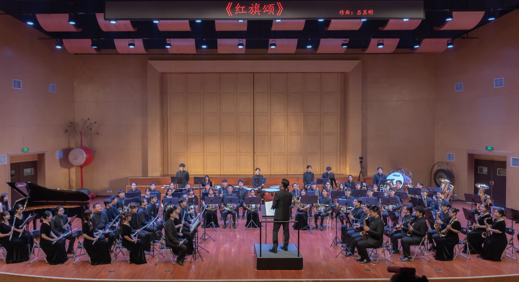 本次军乐团音乐会是“时光留声”毕业系列活动的一部分。军乐团以一曲慷慨激昂的《红旗颂》开场,雄壮威武的《钢铁洪流进行曲》,热情奔放的《北京喜讯到边寨》,温暖深情的《我和我的祖国》,奏响时代主旋律。音乐会中场,一曲《天空之城》柔和舒缓,《小夜曲》唯美典雅,《吹响吧 上低音号》轻快高扬,《残酷天使的行动纲领》明快激昂。音乐会下半场,《帝国进行曲》《奥林匹克号角》《加勒比海盗组曲》《珠穆朗玛》等耳熟能详的电影配乐,节奏多变,气势恢宏。